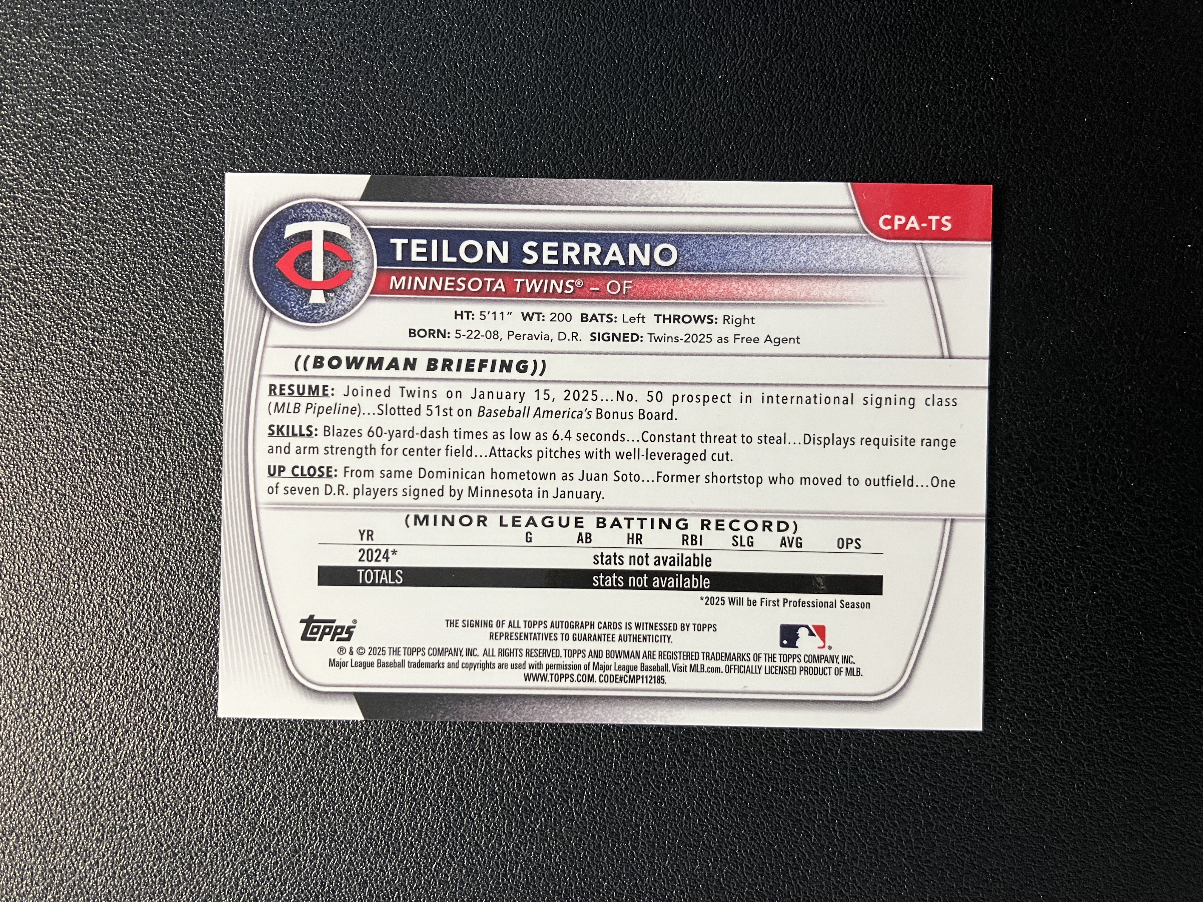 2025 Topps Bowman Chrome Teilón Serrano 泰隆-塞拉诺 单人签字 卡签 1st 明尼苏达双城 卡品如图 B227