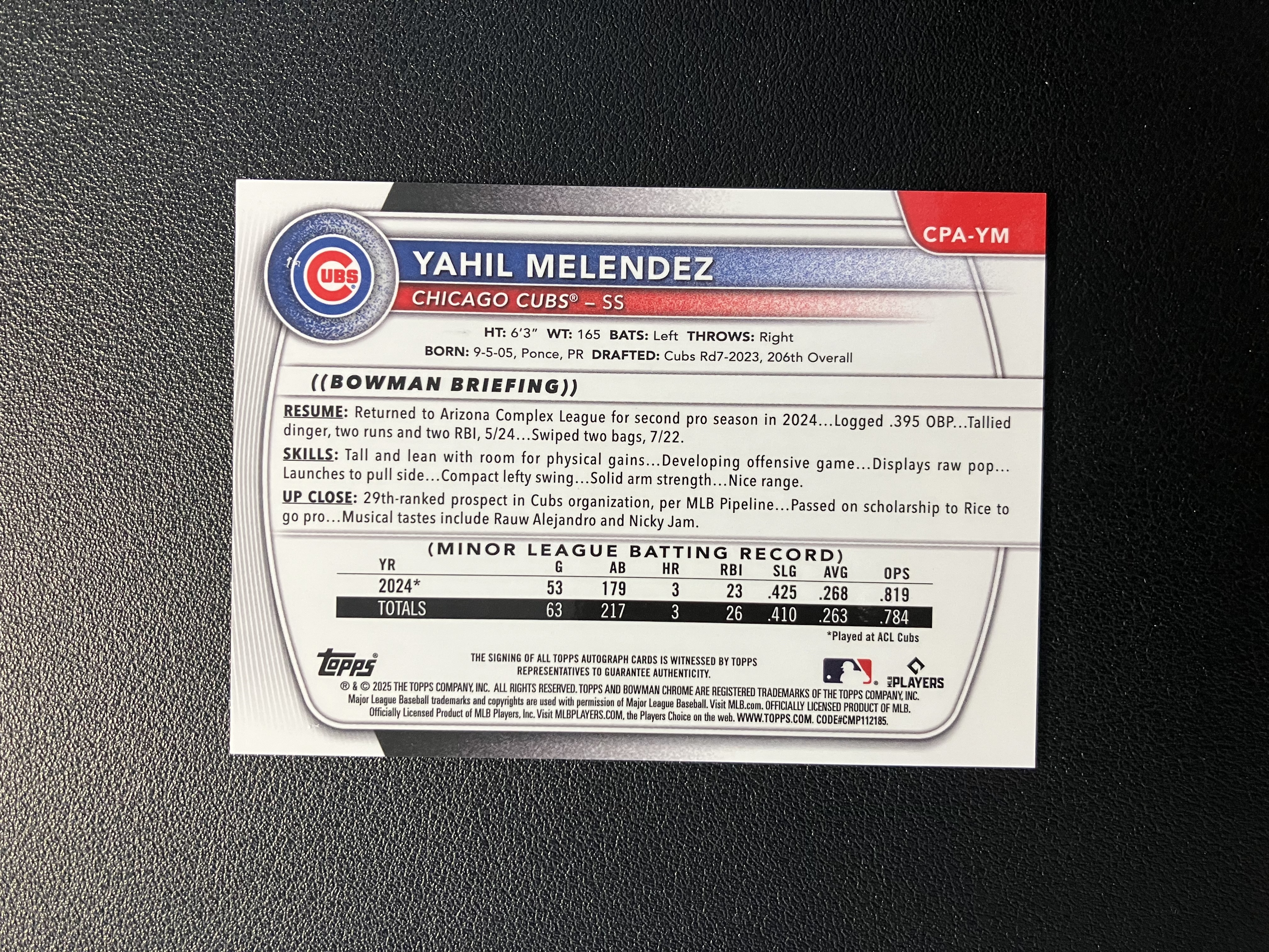 2025 Topps Bowman Chrome Yahil Melendez 亚希尔-梅伦德斯 单人签字 卡签 1st 芝加哥小熊 卡品如图 B227