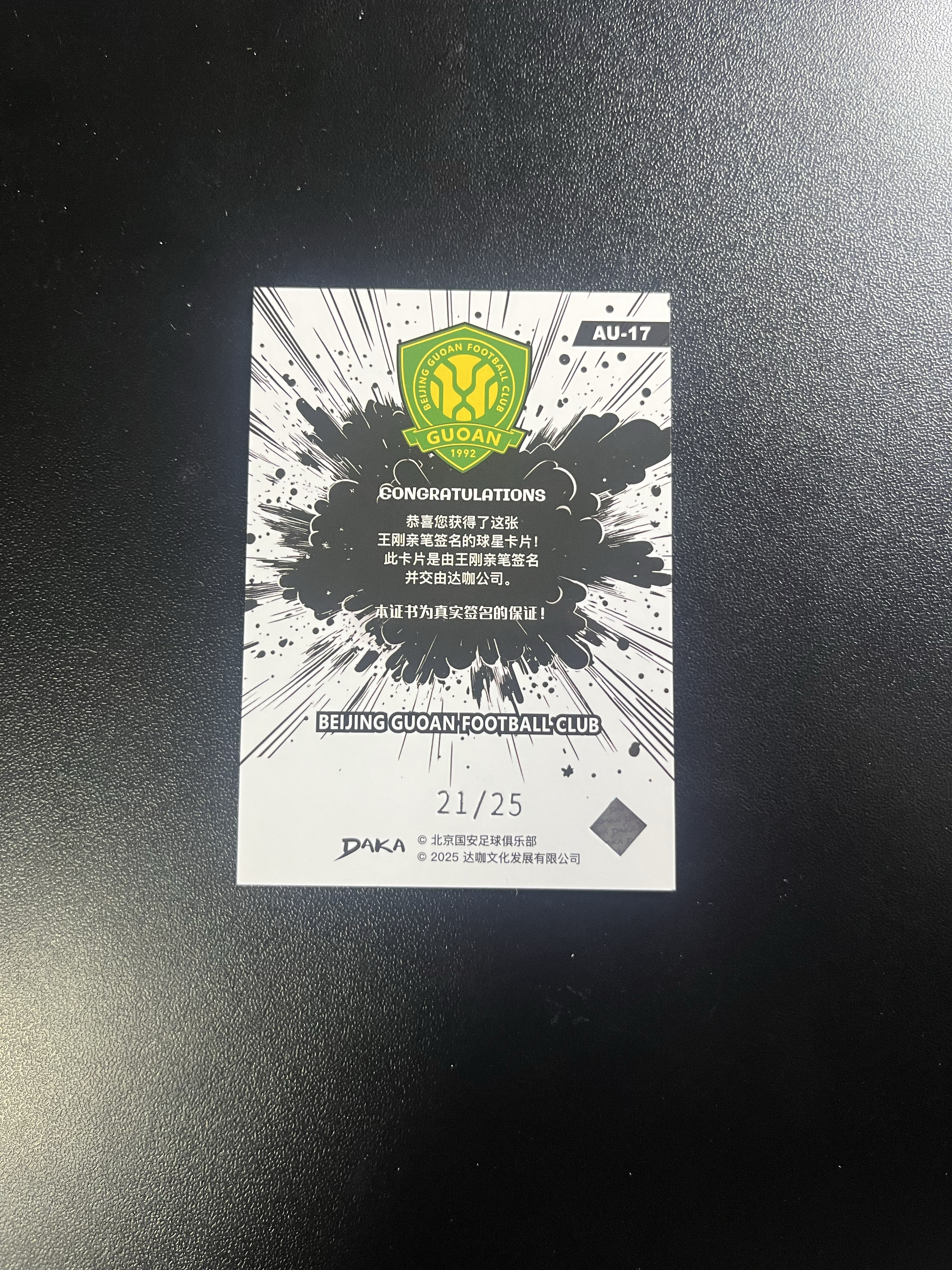 2025 DAKA 达咖 王刚 【拉姆代卖】2025 DAKA 达咖 北京国安队盒 王刚 卡签 签字 签名 银折 21/25编 收藏必备 卡品如图 鲁【LAN】