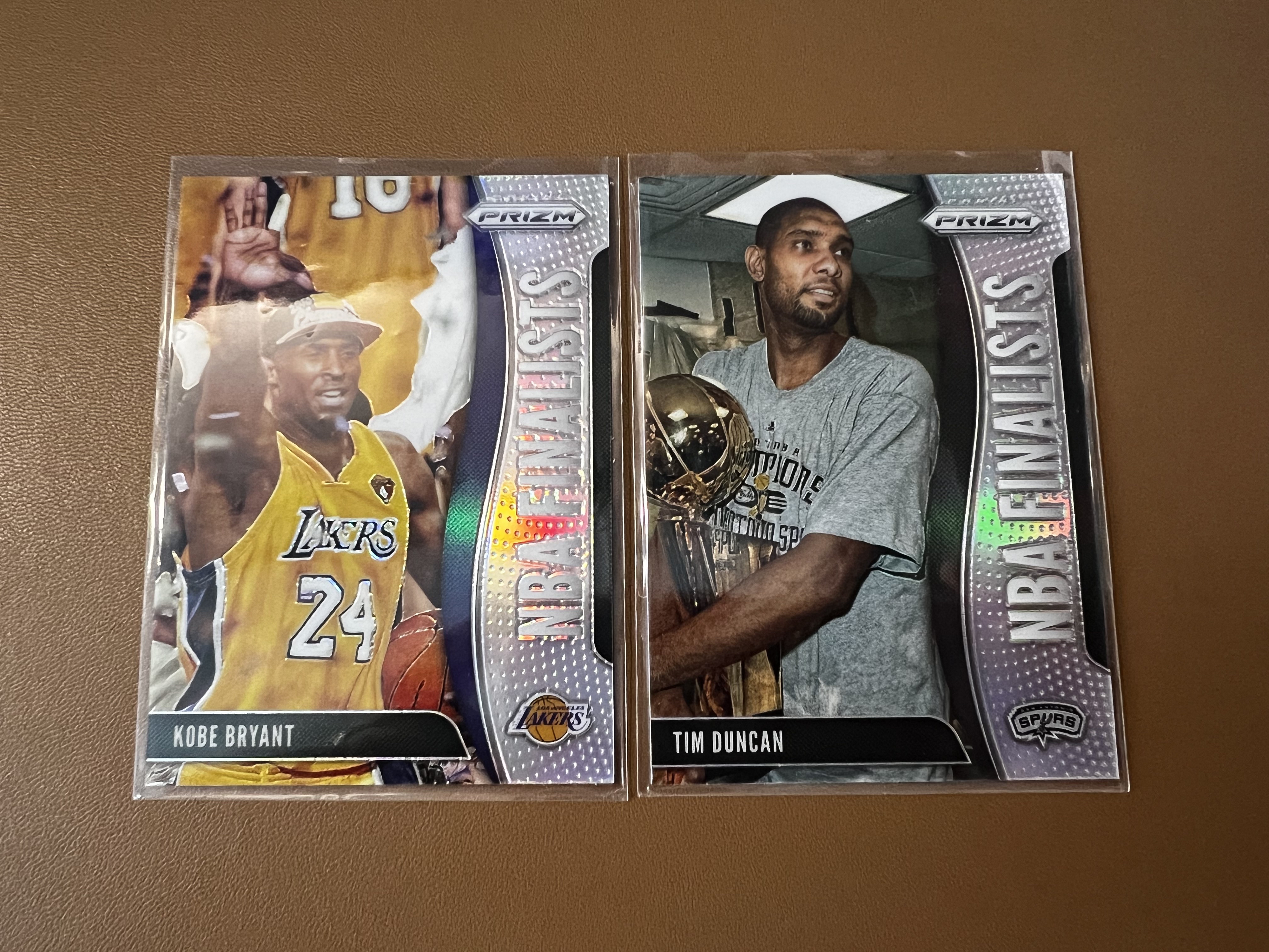 2019-20 Panini Prizm Kobe Bryant Lot*2,科比布莱恩特&蒂姆邓肯,湖人曼巴马刺石佛,帕尼尼Prizm,总冠军特卡银折,两张打包,折射效果超炫!(科比背面左下角不好)