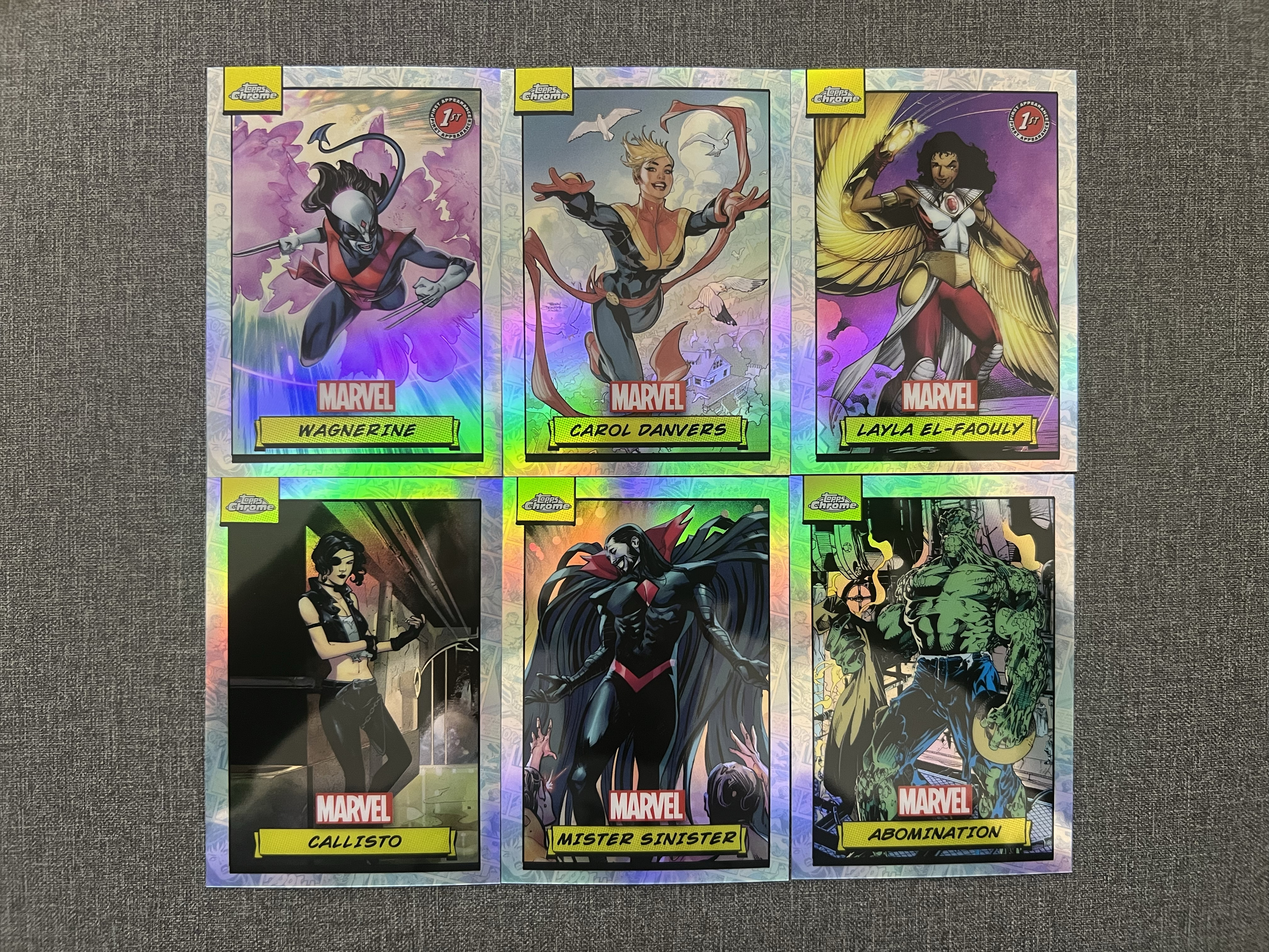 2024 Topps Marvel (MCU) Chrome Chrome 漫威 元年TC 惊奇队长 猩红圣甲虫 瓦纳狼 憎恶 卡利斯托 惊恶先生 普折 折射 银折 6张打包 品相如图