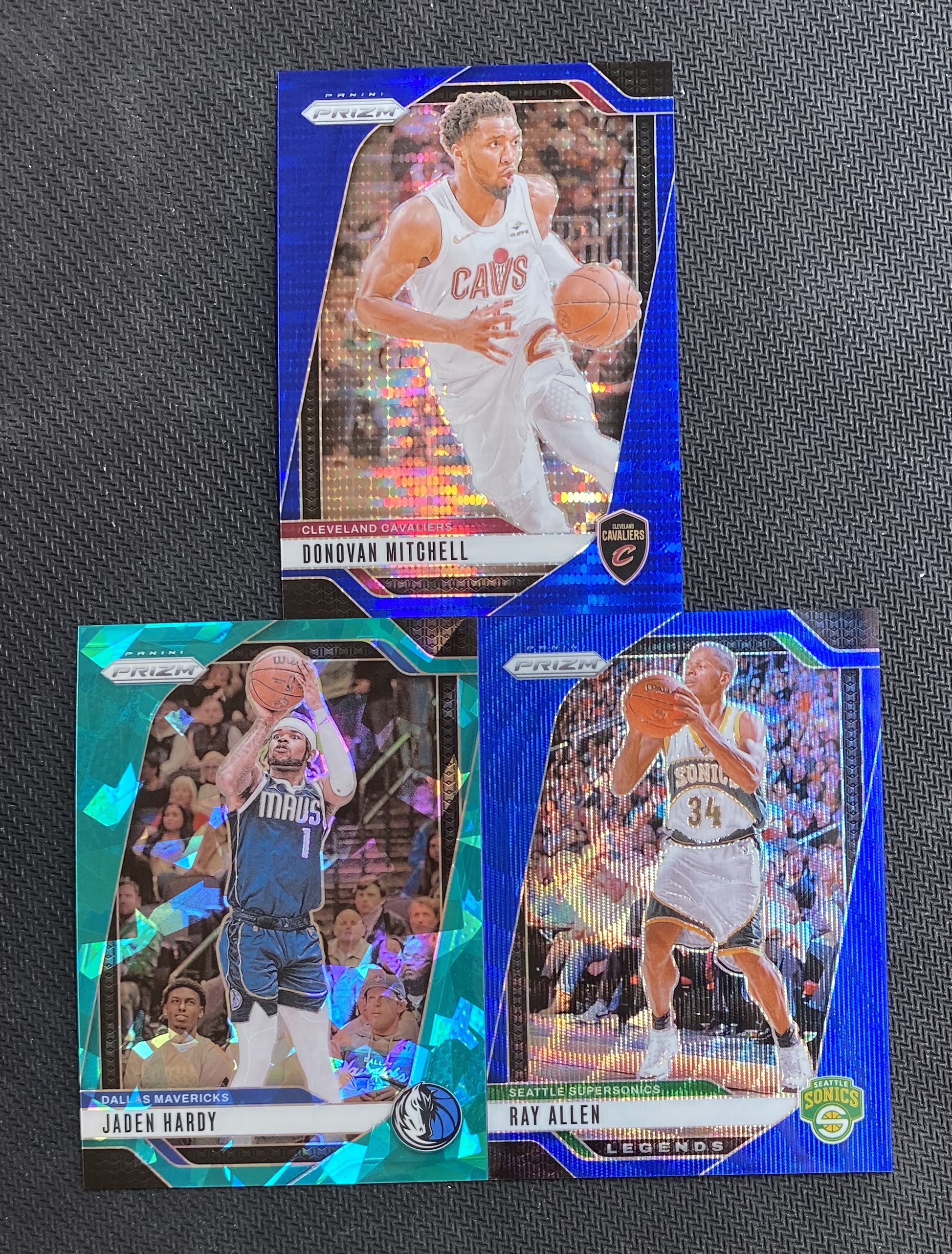 2024-25 Panini Prizm系列 多诺万米切尔 99编蓝脉冲折 + 雷阿伦 125编蓝波纹折 + 杰登哈迪 225编青碎冰折 打包 个别正反面划痕磨损 品控慎拍 不累计 菊-随意哥