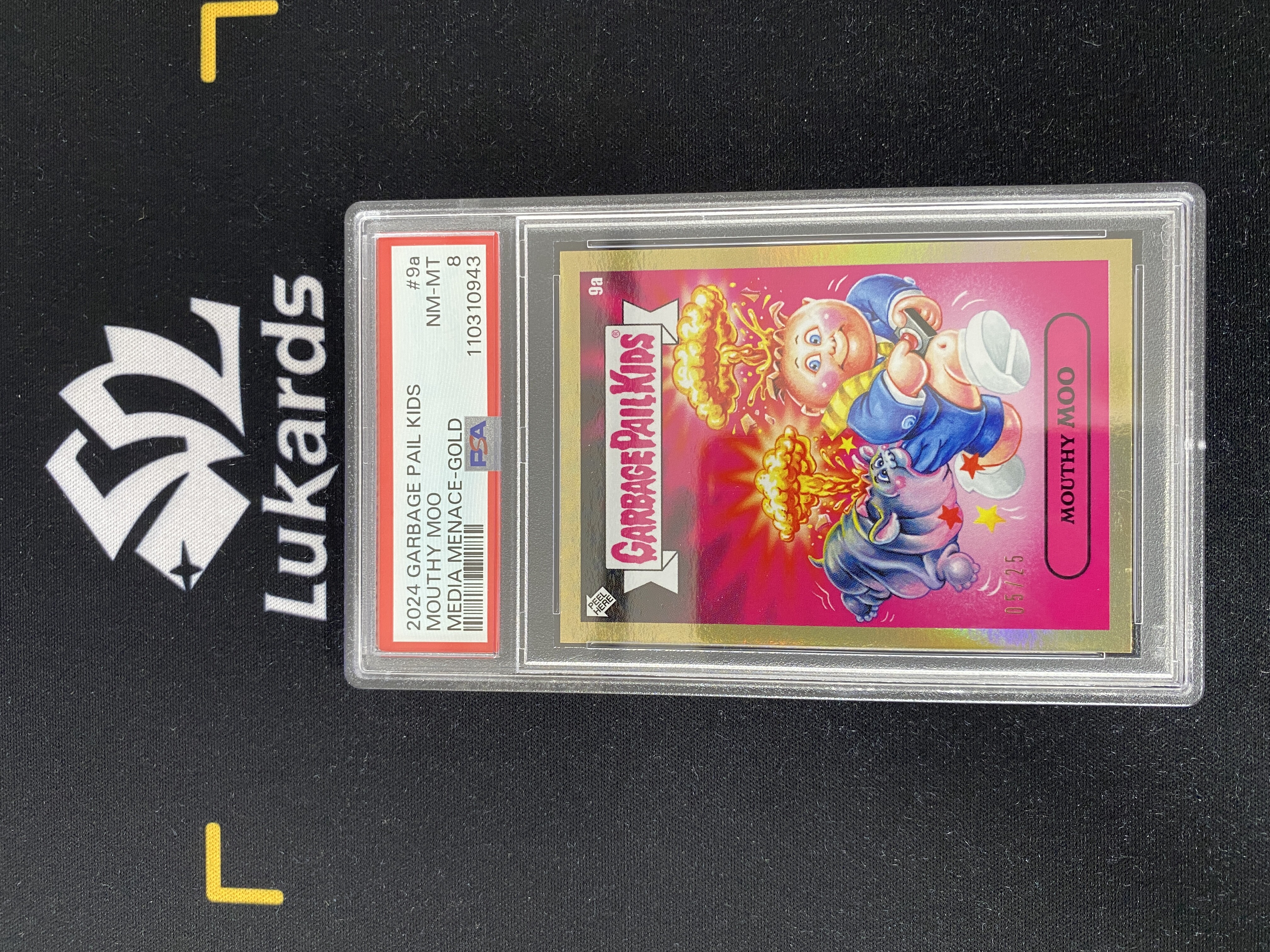 2024 Topps Garbage Pail Kids Mouthy Moo 垃圾桶小子GPK 媒体威胁 亚当爆炸 #9a 金折 超大比例 经典选图 5/25编 PSA 8 7.8-轻松哥-Z27