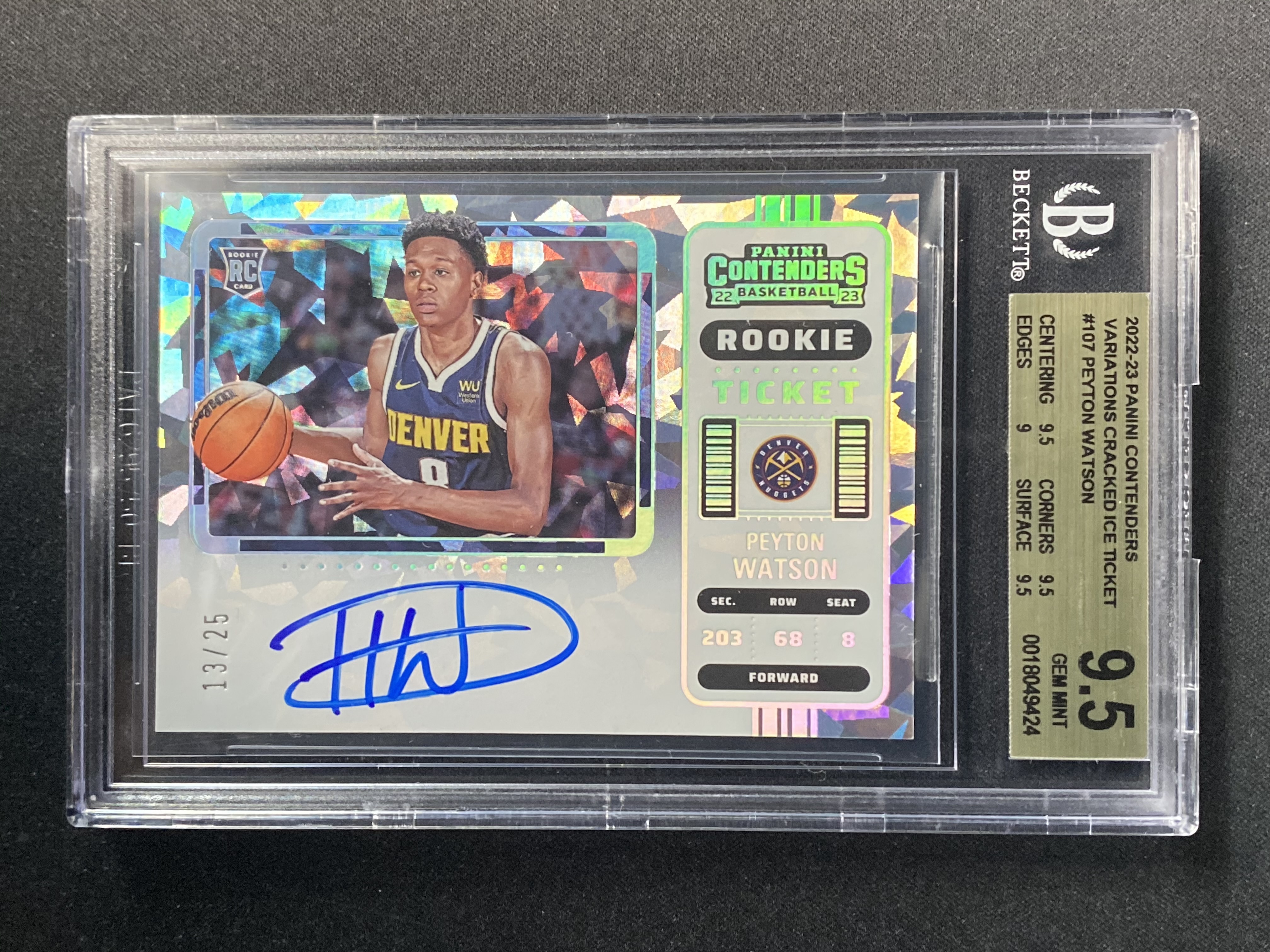 2022-23 球票 Contenders Peyton Watson 掘金 佩顿 沃特森 新秀RC /25编 变化版 卡签 签字 碎冰折 系列博点 BGS9.5分金标评级卡-WYX-【小幻拍卖】D
