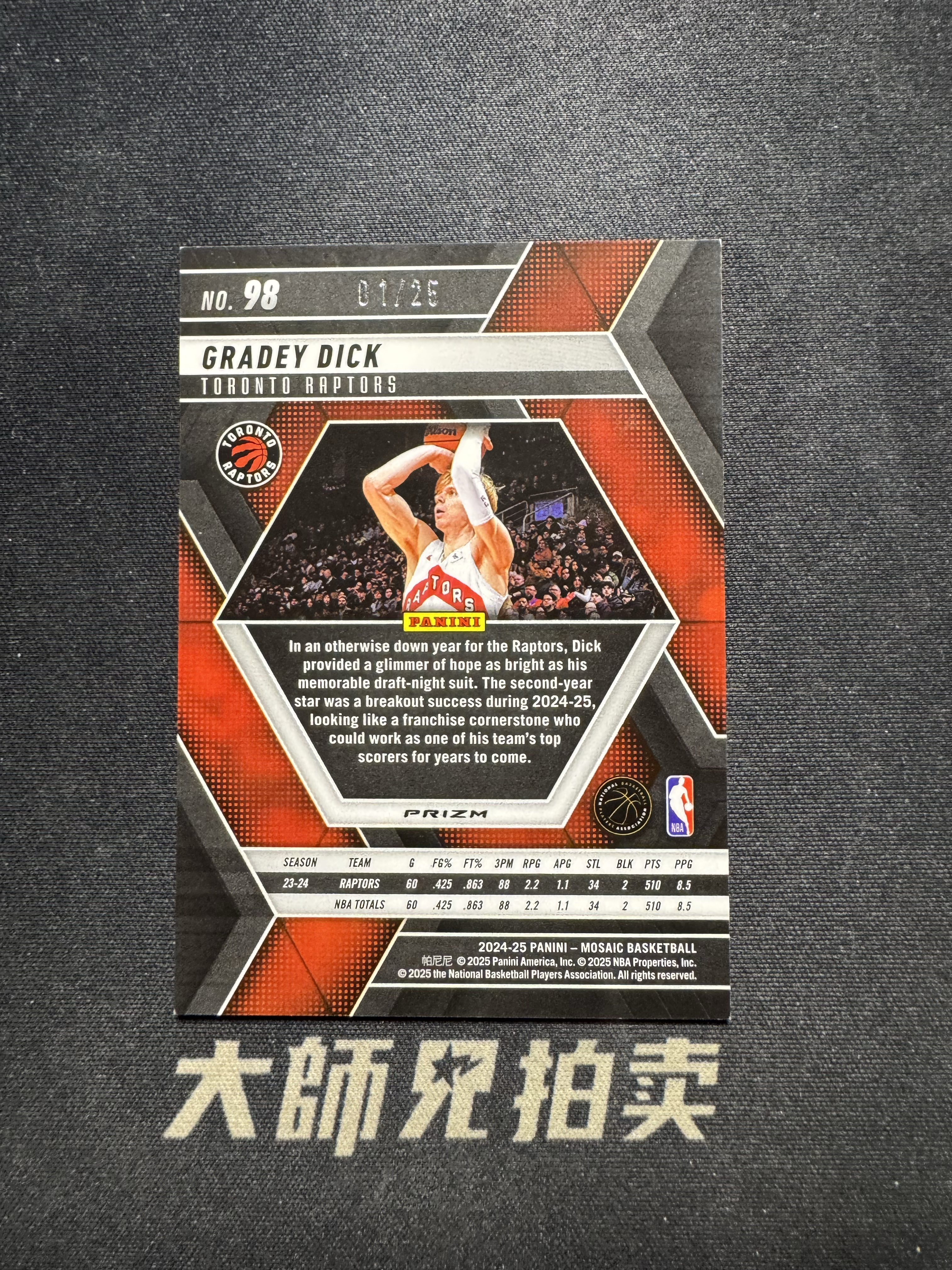 【大师兄拍卖】2024-25 panini mosaic GRADEY DICK 猛龙 迪克 马赛克 01/25编 同背 白折 细节看图 -多说无益-