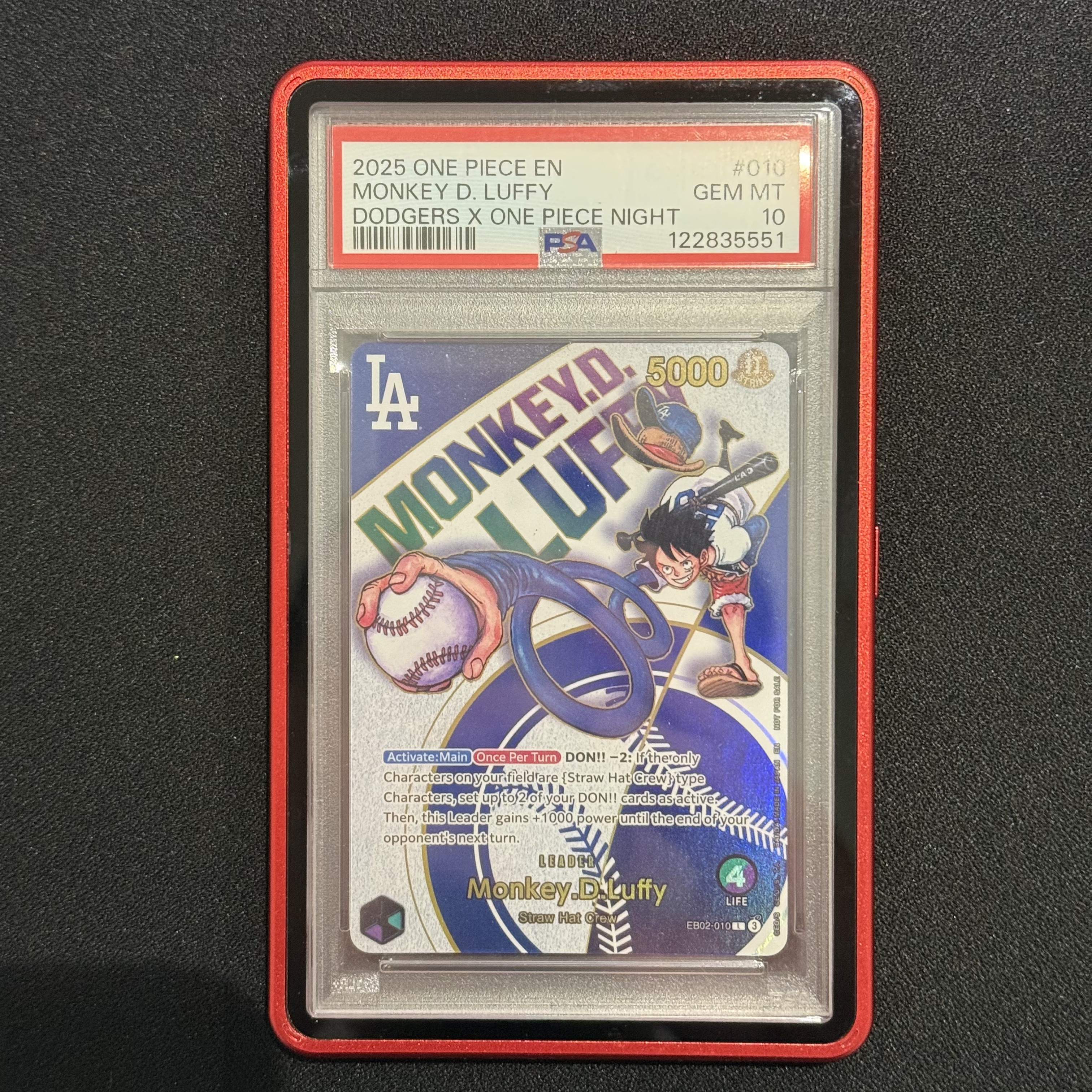 乐飞拍卖 LF-A02 2025 One Piece EN Monkey D.Luffy 万代 海贼王 英文美版 棒球路飞 道奇路飞 蒙奇·D·路飞 洛杉矶道奇联名P卡 领袖L 异画 PSA10