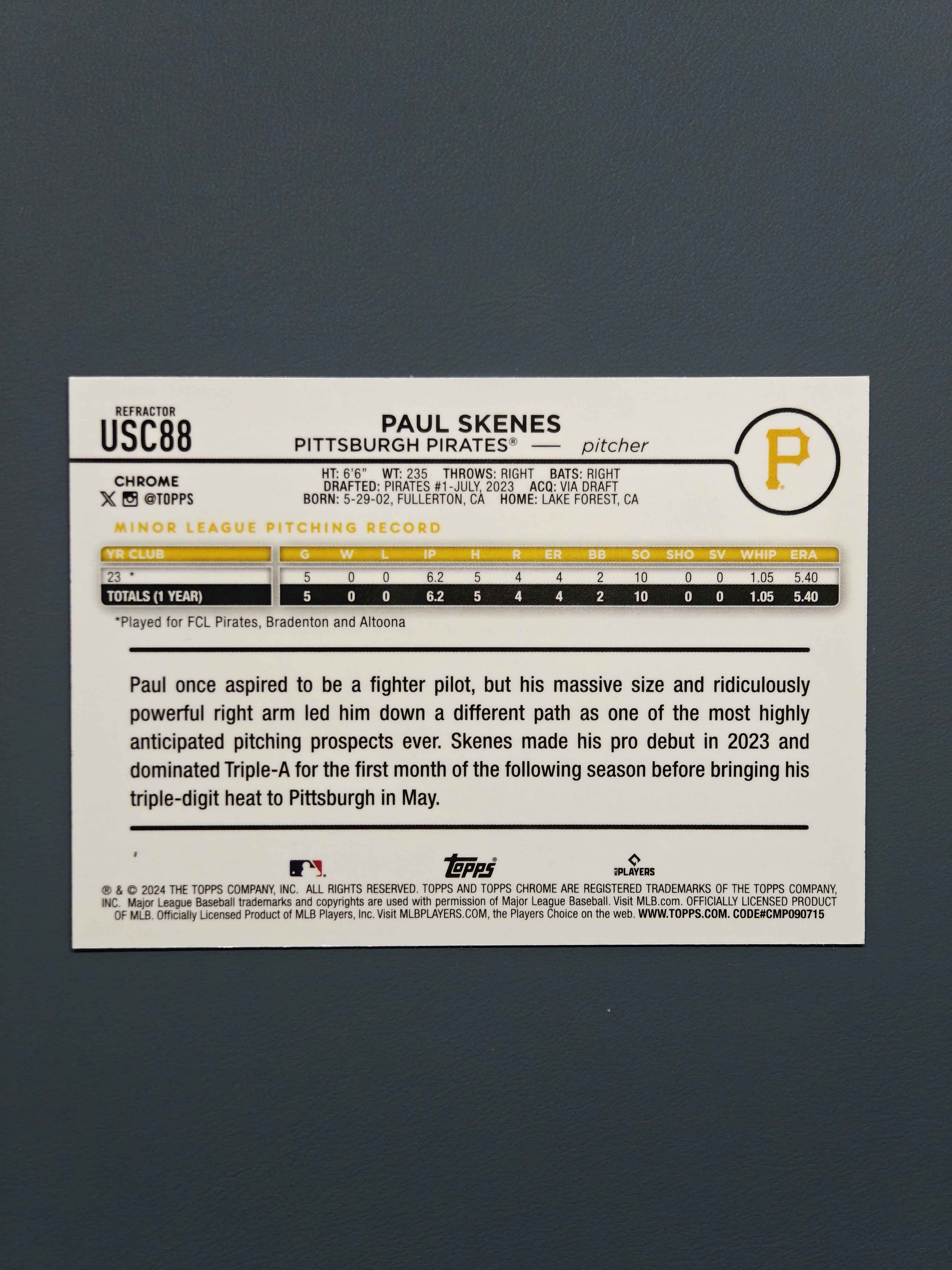 2024 Topps Chrome Paul Skenes RC 保罗 斯肯斯 斯金斯 银折 新秀正Base 预定本赛季赛扬 顶级投手 海盗看板球星 硬通货
