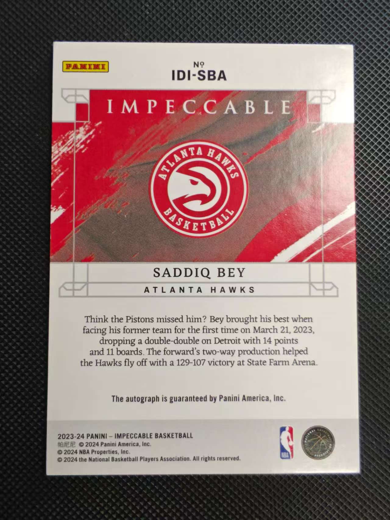 2023-24 Panini Impeccable Saddiq Bey 小真金 老鹰 萨迪克贝 25编 低编 签字 卡签 折射 base 特卡 0924菠萝