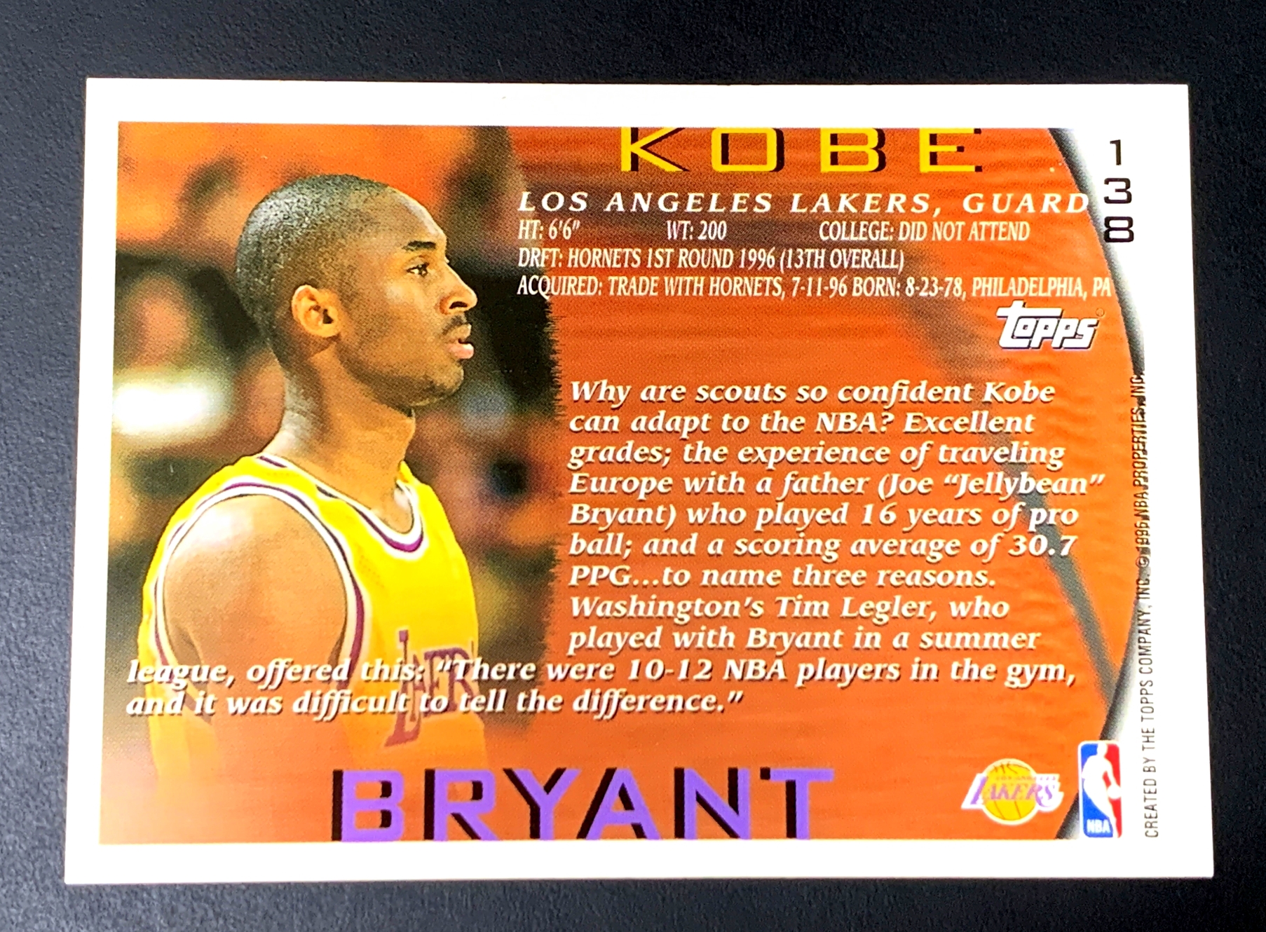 1996-97 Topps topps Kobe Bryant RC 科比 布莱恩特 湖人队 新秀 RC 黑曼巴 96黄金一代 KB 8号时期 经典老卡 品相佳 可送评博高分