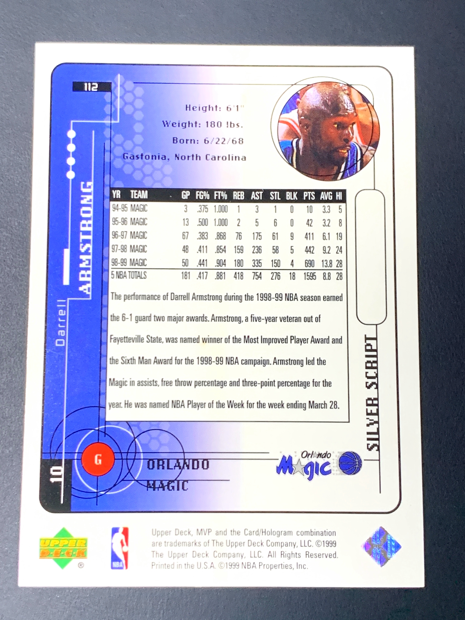 1999-00 Upper Deck MVP Darrell Armstrong MVP系列 魔术队 阿姆斯特朗 银签字卡 印签卡 经典老特卡 品相通品 凑套必备