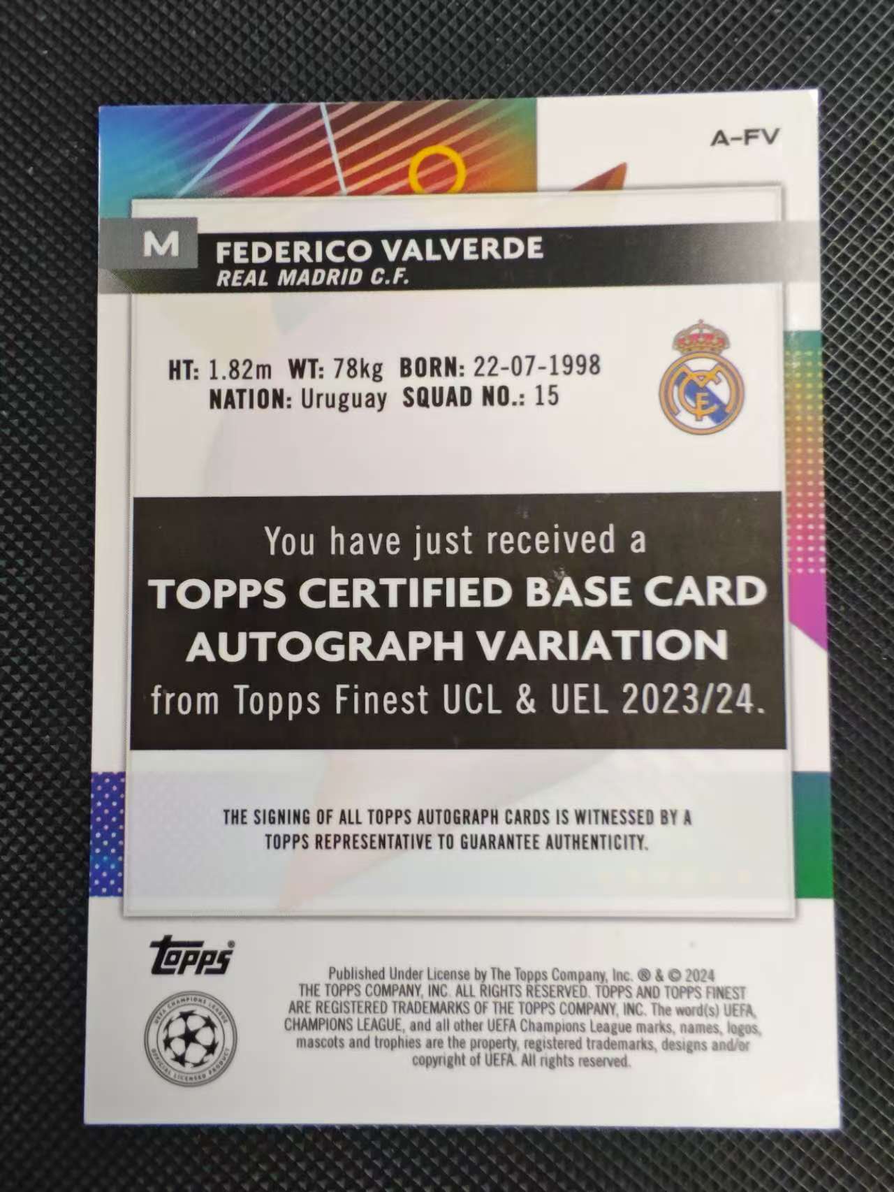2023-24 Topps Finest Federico Valverde 欧冠 皇马 巴尔韦德 签字 银折 折射 base 特卡