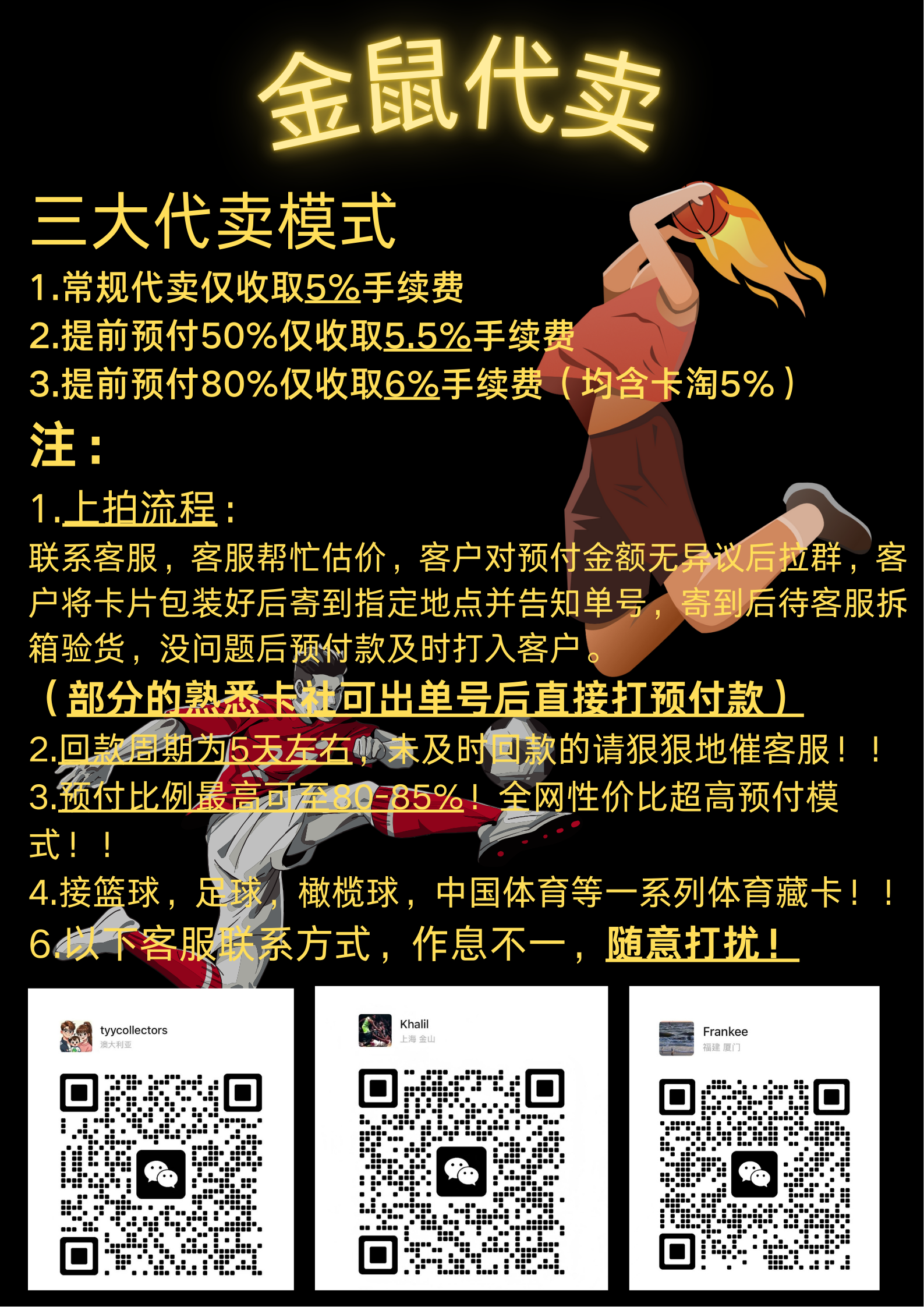1:金鼠代卖 模式一:正常上拍,只收取卡淘5%,卡淘回款后立即结算,预计7天 模式二:提前预付50%,卡片寄到后确认无误即可打款,收取5.5%(含卡淘费率),买家确认收货后立即结算回款 模式三:提前预付80%,卡片寄到后确认无误即可打款,收取6%(含卡淘费率),买家确认收货后立即结算回款。 注:卡淘回款周期一般为截标后卖家付款确认到货后为准;有需要代卖联系客服微信:Timeless811Khalil;2:卡品如展示图所示,默认通行品相(厚卡异形卡老卡白边白角,折射卡印刷线等均属常见情况),有明显瑕疵会在图片中拍出,卖家出价前请务必看清,不接受中标后没看到其他图片中拍出瑕疵的借口,完美主义者请拍已评级的卡,如卡品有瑕疵且超出通行品范畴未拍出,请开箱时录视频为证并非买家自己失误导致,评级卡不再讨论卡品问题,lot的卡片不保卡品卡具,单卡低于10元不保卡具,单卡高于10元或带编卡片保卡膜和夹; 3:拍品不累积,不累积,不累积!!!如需合并订单请后台私信,合并后请于截标后3天内付款,之后会按照默认地址发出; 4:除部分偏远地区到付外,其余地区快递均统一价18元顺丰陆运寄付不到付,特殊情况需更改空运的,请后台私信,若不接受请勿拍请勿拍请勿拍 5:卡友们有任何问题请私信留言,欢迎关注;玩卡开心第一位,愿大家都可收到自己喜欢的卡。