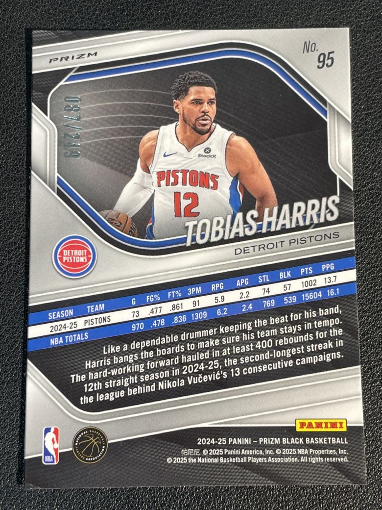 2024-25 Panini Prizm Black Tobias Harris 717 托比亚斯 哈里斯 活塞 折射 银折 银瀑布折 249编 微瑕如图 卡品如图 尖叫代拍 pink