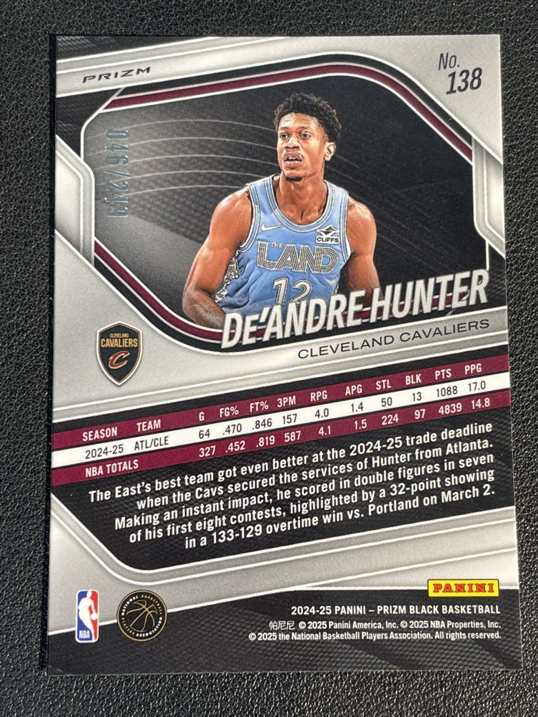 2024-25 Panini Prizm Black De'Andre Hunter 723 德安德烈 亨特 骑士 折射 银折 银瀑布折 249编 微瑕如图 卡品如图 尖叫代拍 pink