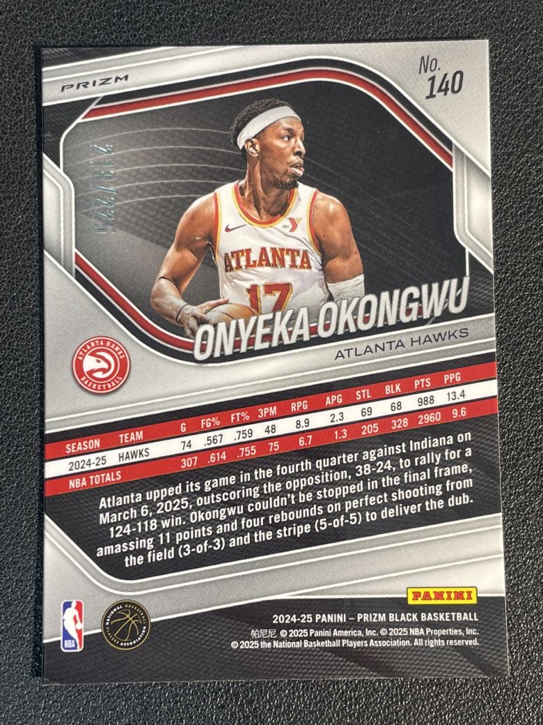 2024-25 Panini Prizm Black Onyeka Okongwu 747 奥耶卡 奥孔古 老鹰 折射 球皮折 225编 实卡精美 卡品如图 尖叫代拍 pink