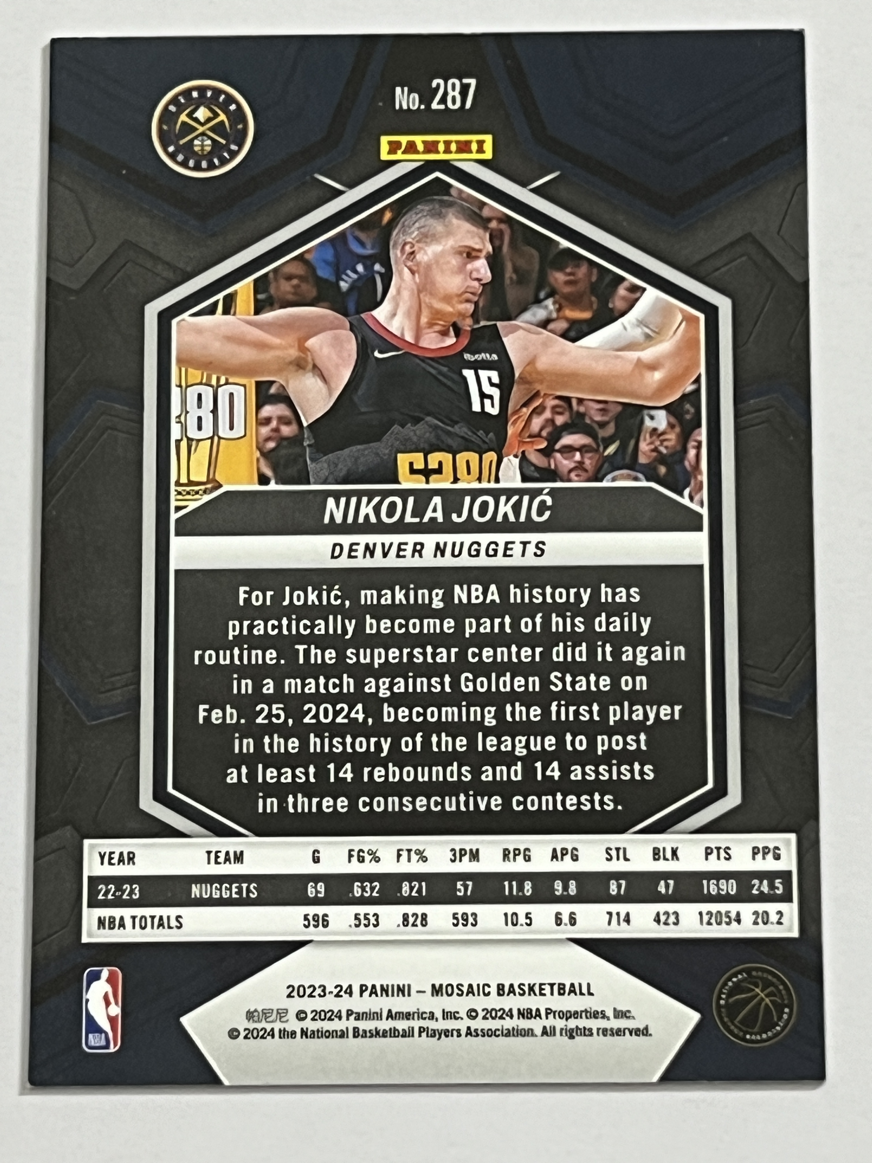2023-24 Panini Mosaic Nikola Jokic 尼古拉 约基奇 约老师 掘金队 《 热门球星 收藏必备 》 实卡精美 #287