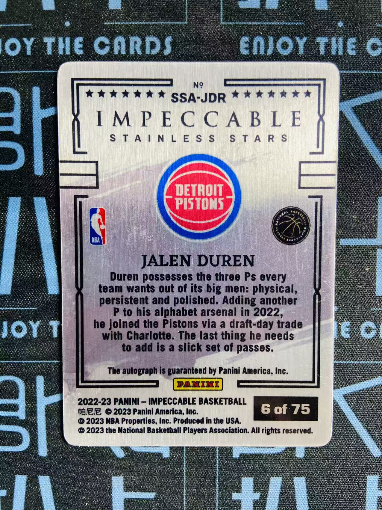 【要预付 找扒卡】2023-24 Panini Impeccable Jalen Duren 小真金 杰伦 杜伦 活塞 新秀RC 签字 卡签 铁板签 /75编 RA 投资收藏必备 开刚1014BK02