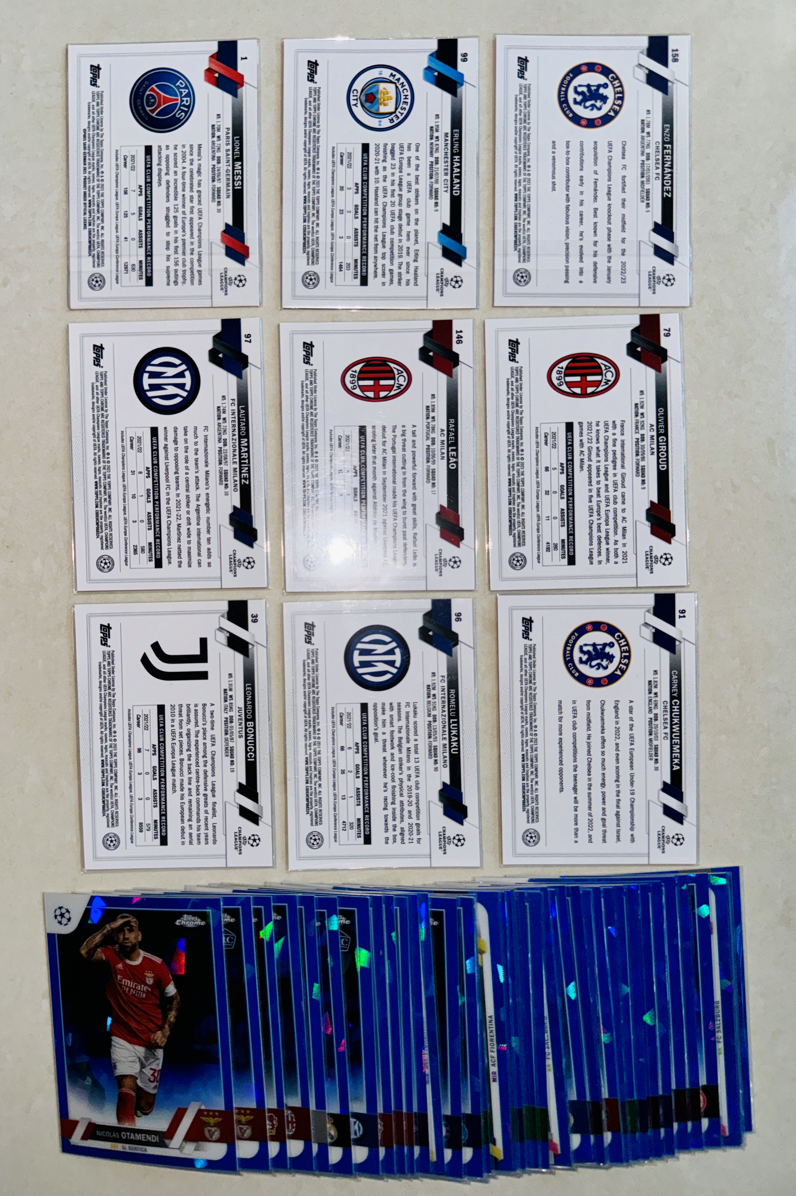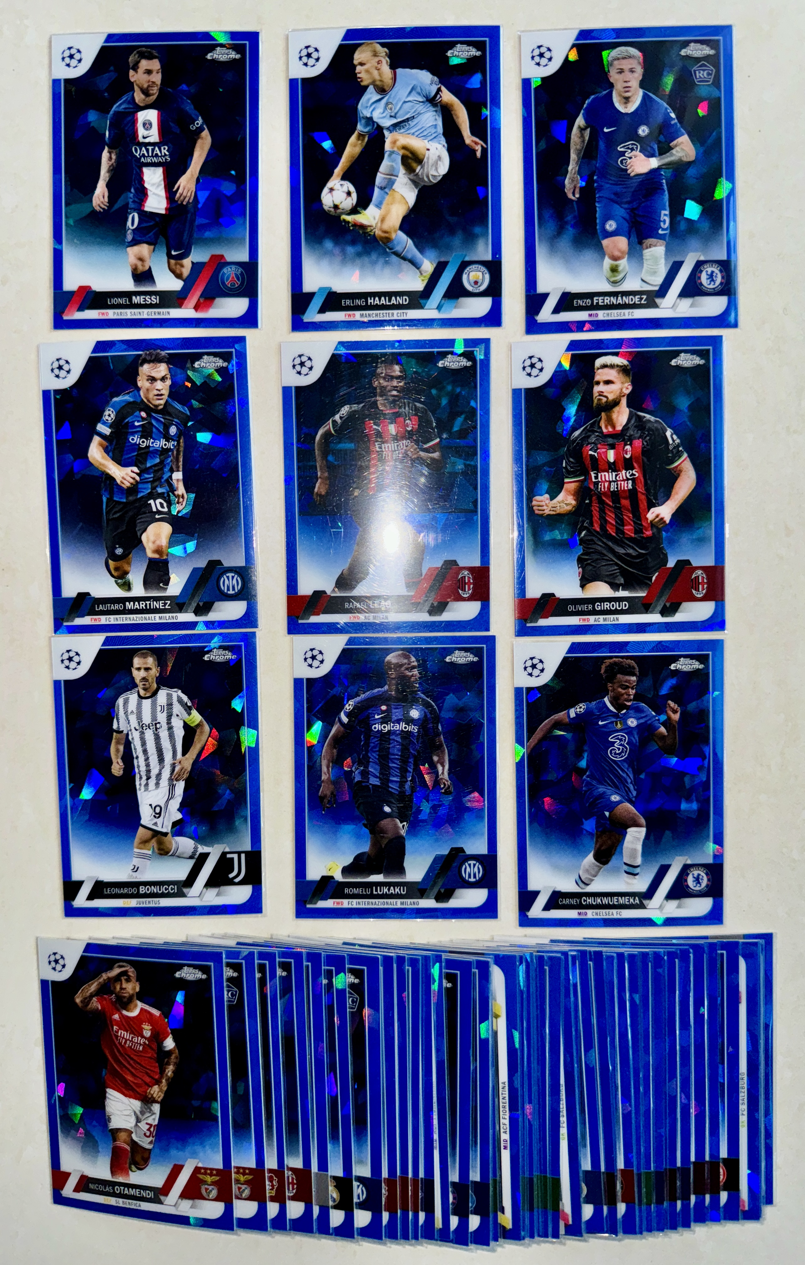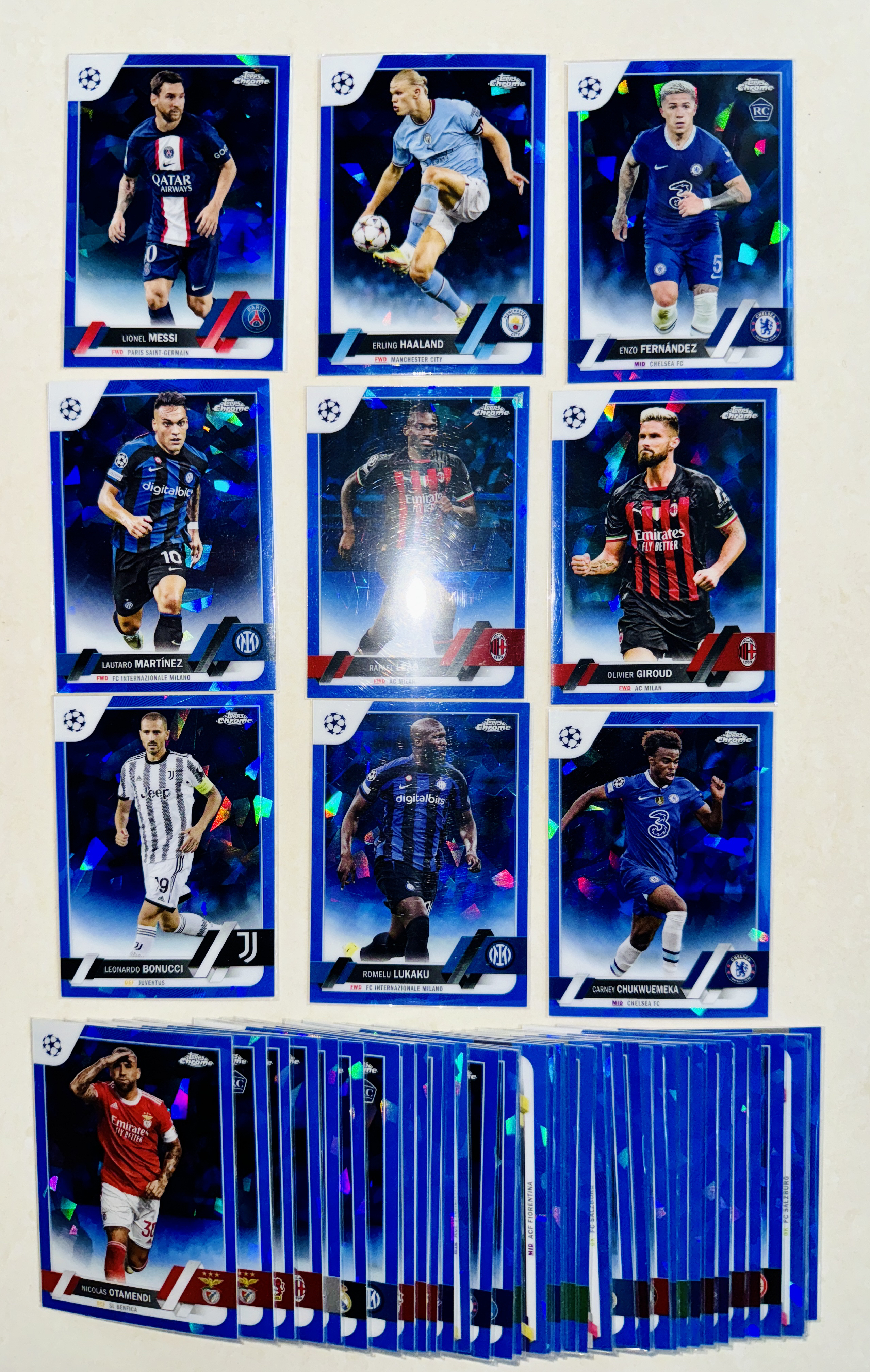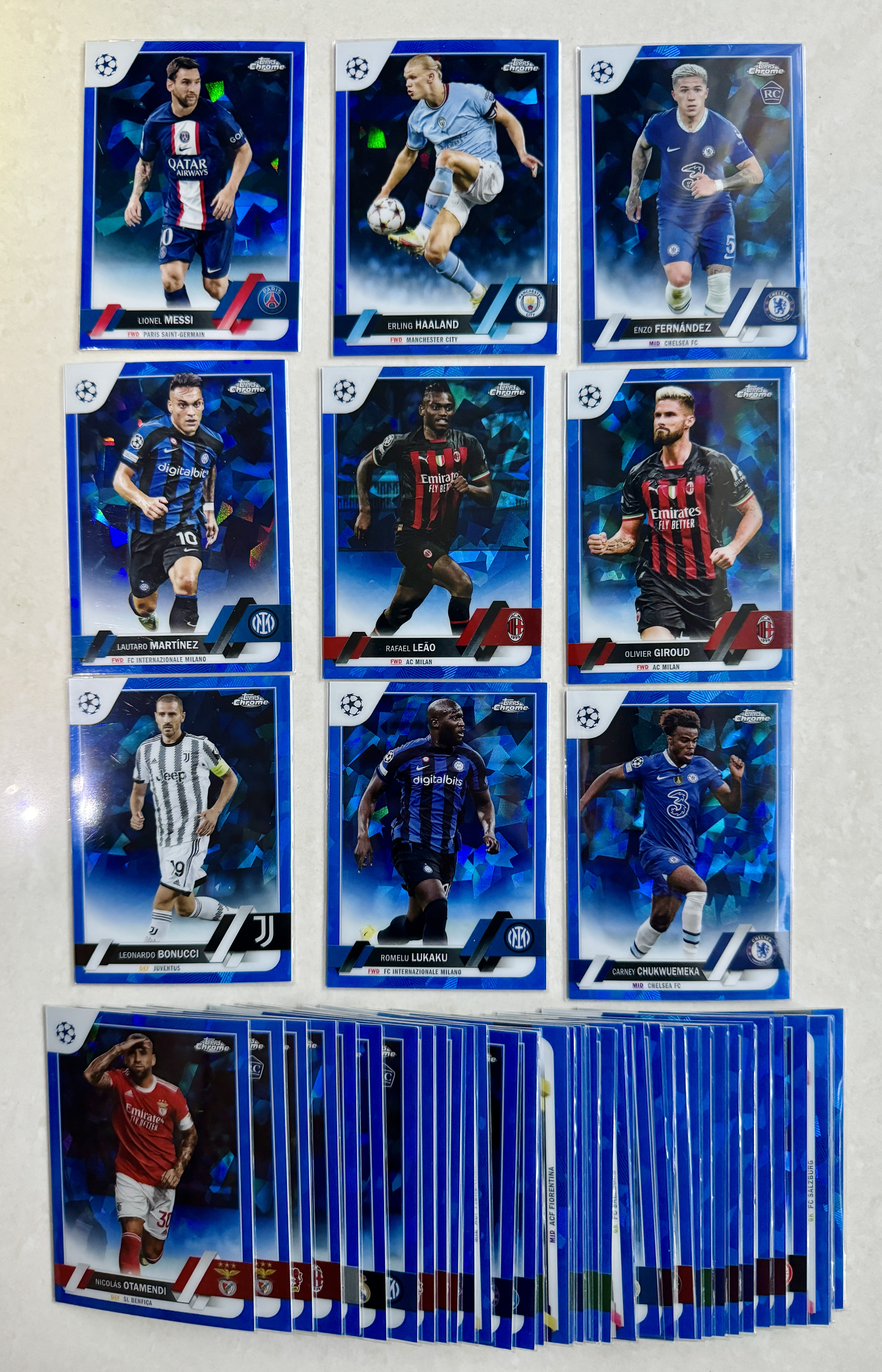 2023 Topps Chrome 蓝宝石盒 蓝碎冰 RC 巴萨大巴黎曼城国际米兰米兰多特蒙德切尔西尤文皇马 梅西 哈兰德 恩佐费尔南德斯 劳塔罗 莱奥 吉鲁 博努奇 卢卡库丘库埃梅卡等48张不保卡品