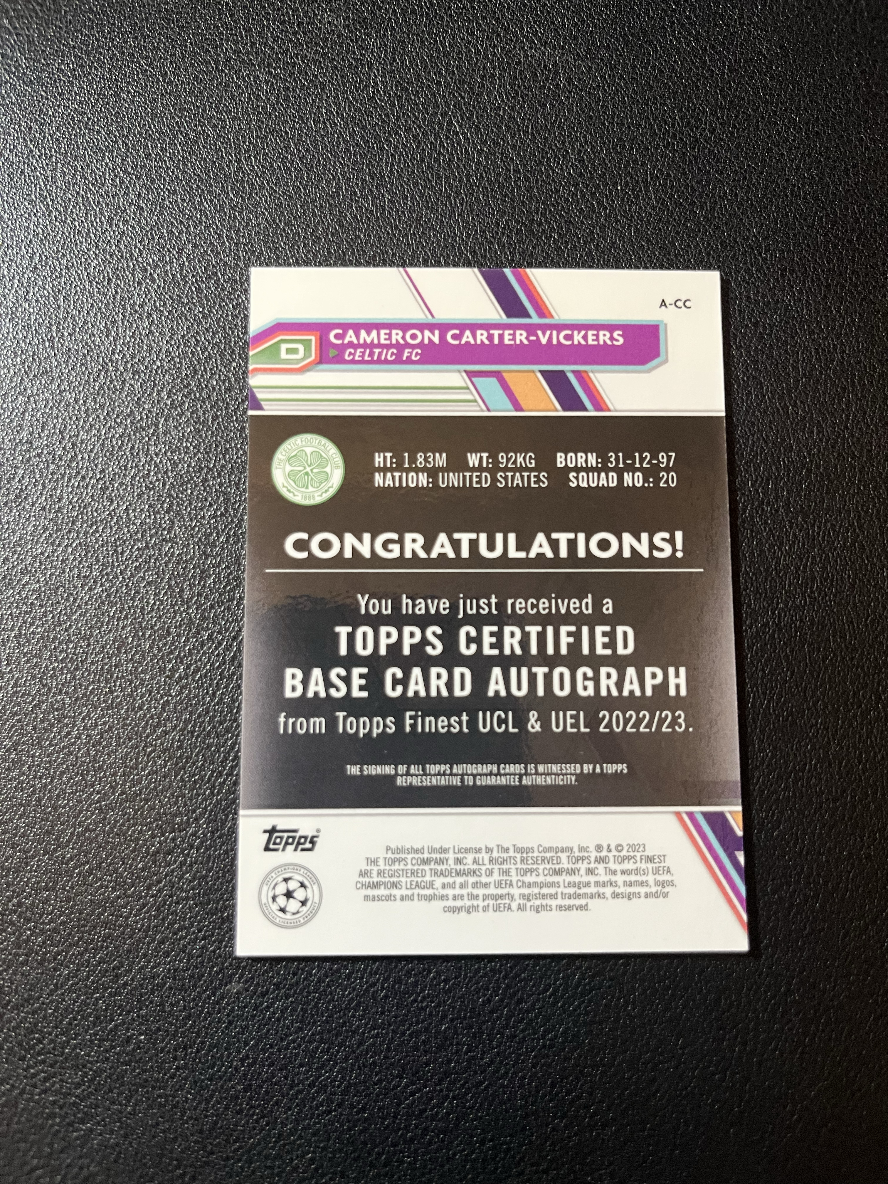 2023 Topps Finest Cameron Carter Vickers 欧冠finest 凯尔特人 维克斯 银折 签字 完美签 实卡精美 投资收藏必备 叶