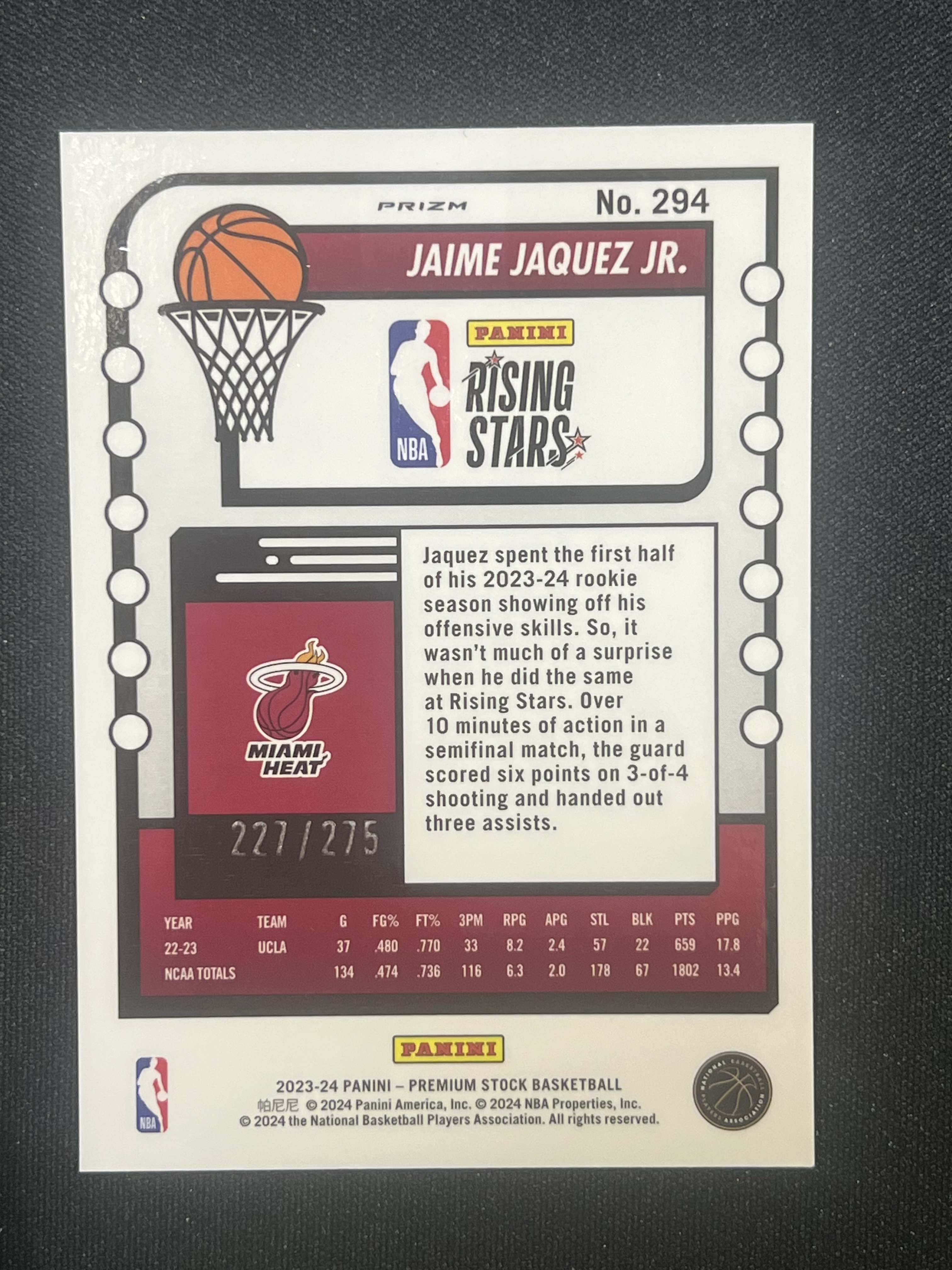 【卡卡星拍卖】 2023-24 Panini premium stock Jaime Jaquez Jr. RC hoops 热火 小海梅 哈克斯 新秀 275编 红折 折射 卡品如图 XT