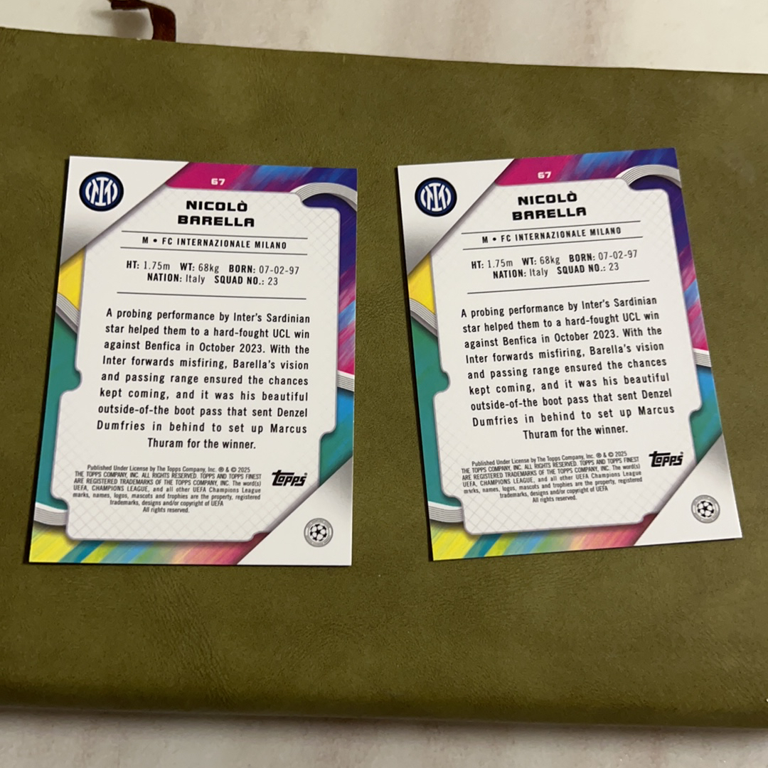 2024-25 Topps Finest Nicolò Barella 尼克洛 巴雷拉 两张 lot 凑彩虹套 /250编 /299编 收藏必备 凑套必备