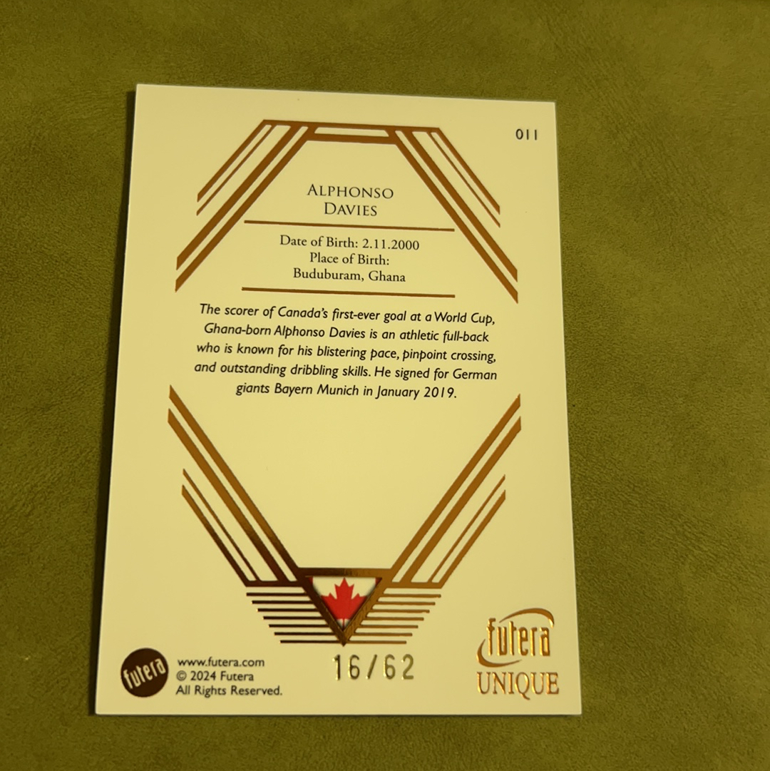 2024 Futera Futera Unique Alphonso Davies 阿方索 戴维斯 加拿大 拜仁 拜仁慕尼黑 福特拉 贝斯 16/62编 收藏必备 凑套必备