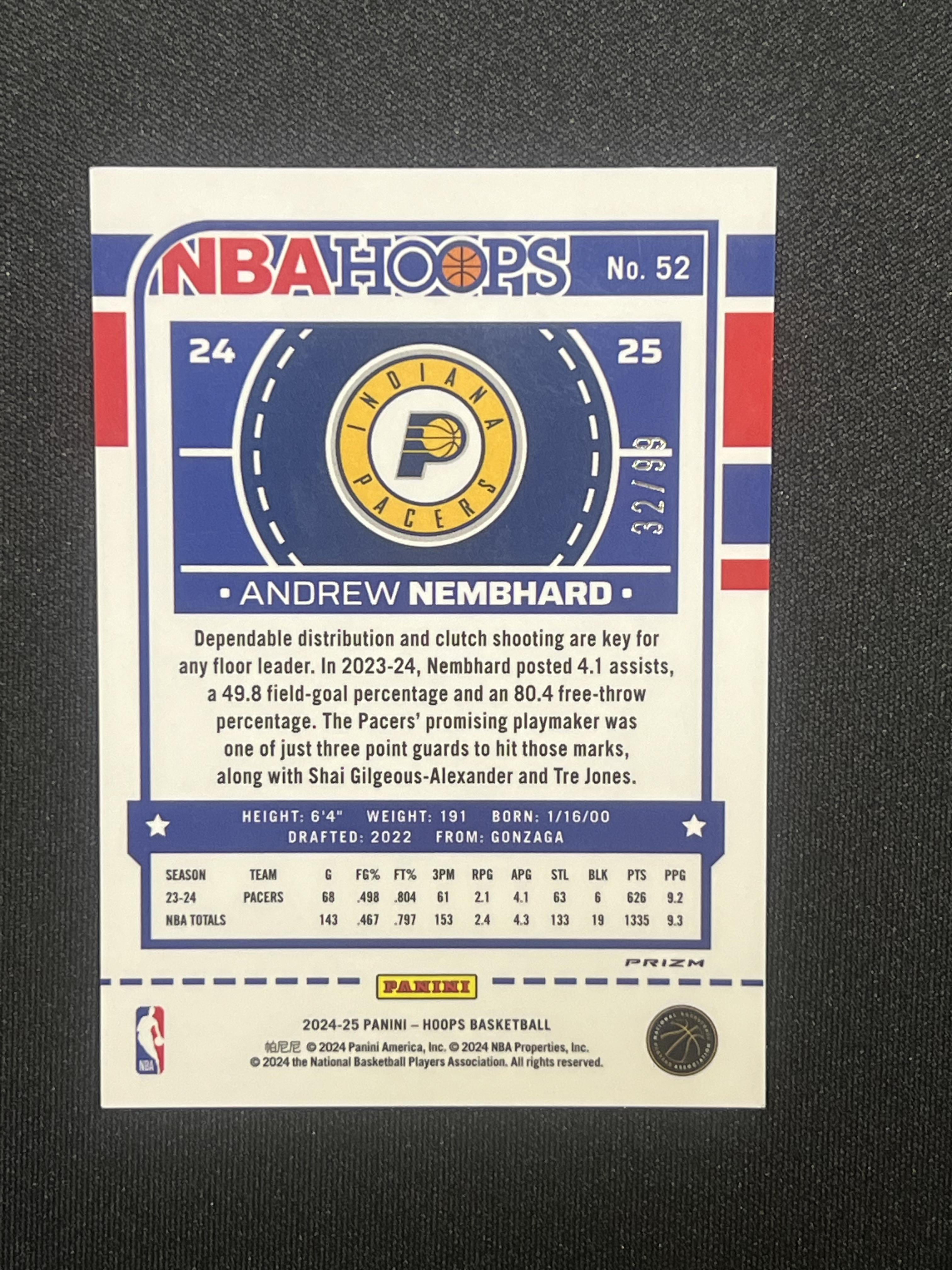 【卡卡星拍卖】2024-25 PANINI HOOPS ANDREW NEMBHARD 安德鲁 内姆布哈德 99编 折射 蓝圈圈折 季后赛奇兵 步行者 篮球 卡品如图 宋