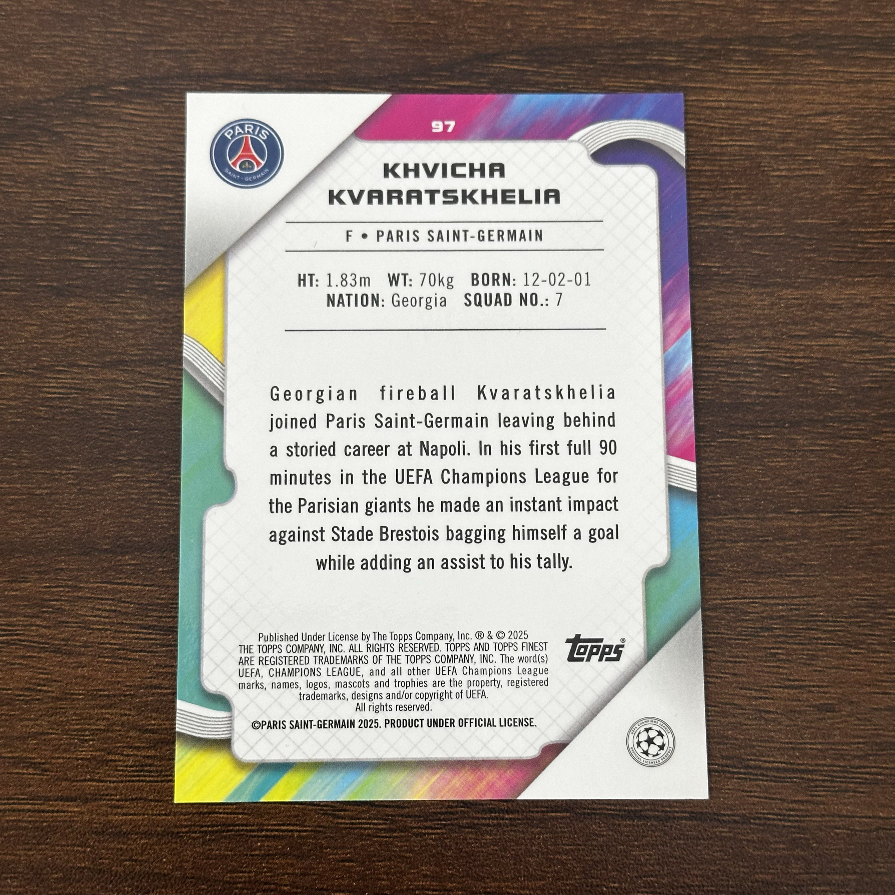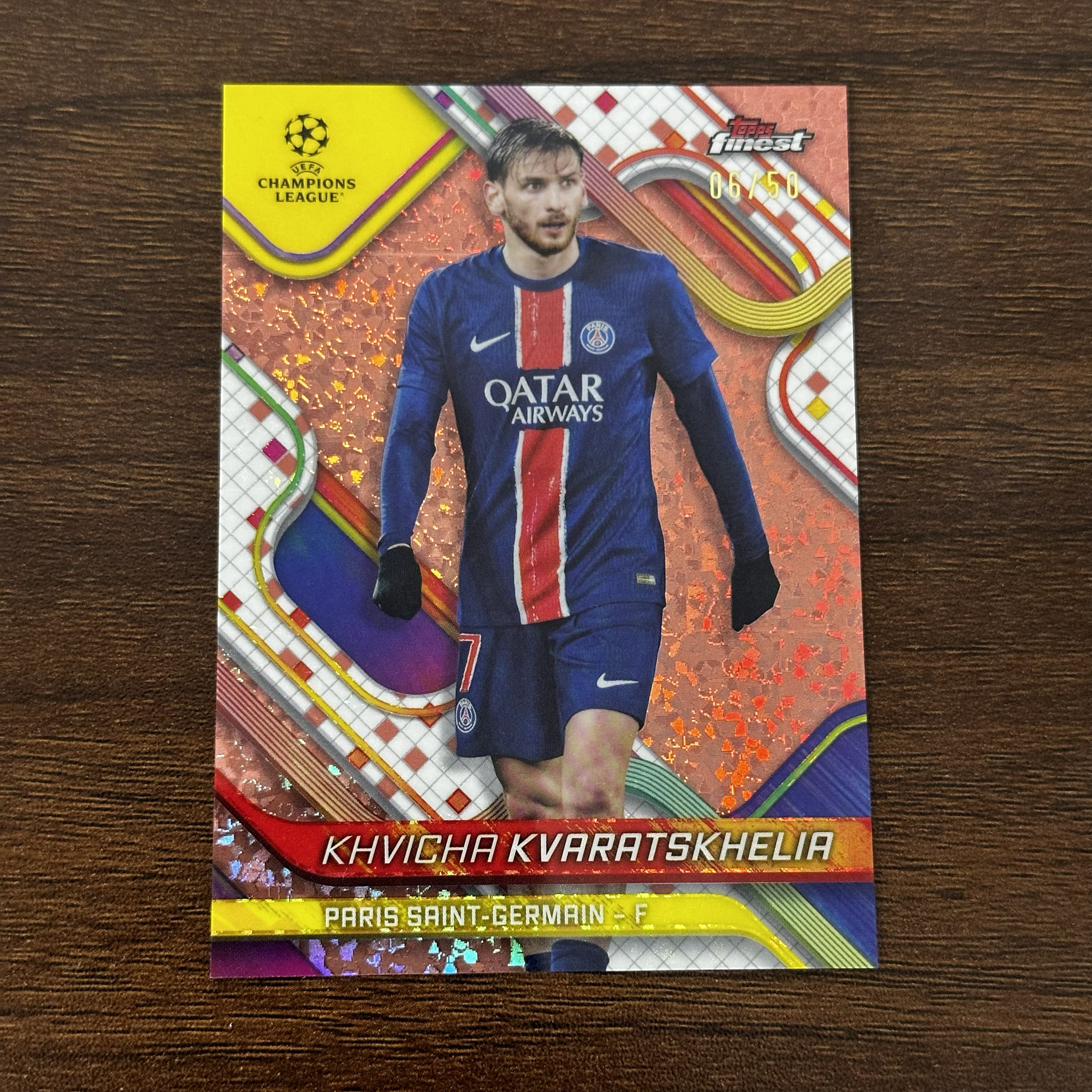 2025 Topps Finest khvicha kvaratskhelia 欧冠 大巴黎 K77 克瓦拉茨赫利亚 50编 玫瑰金碎钻折 卡品如图