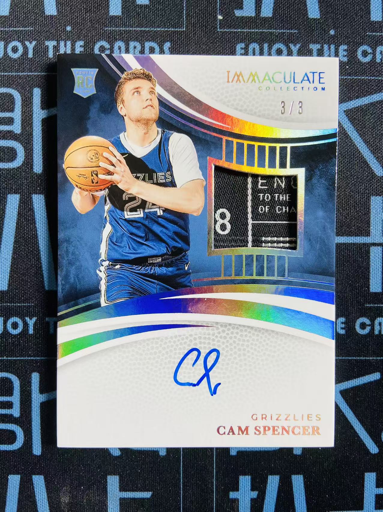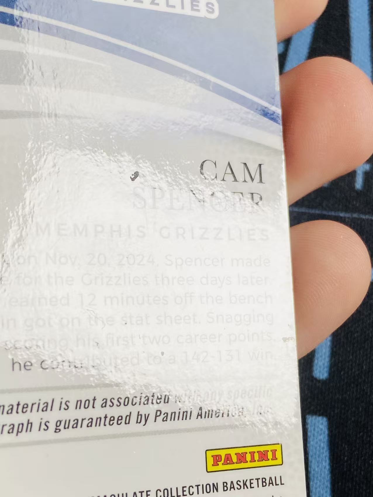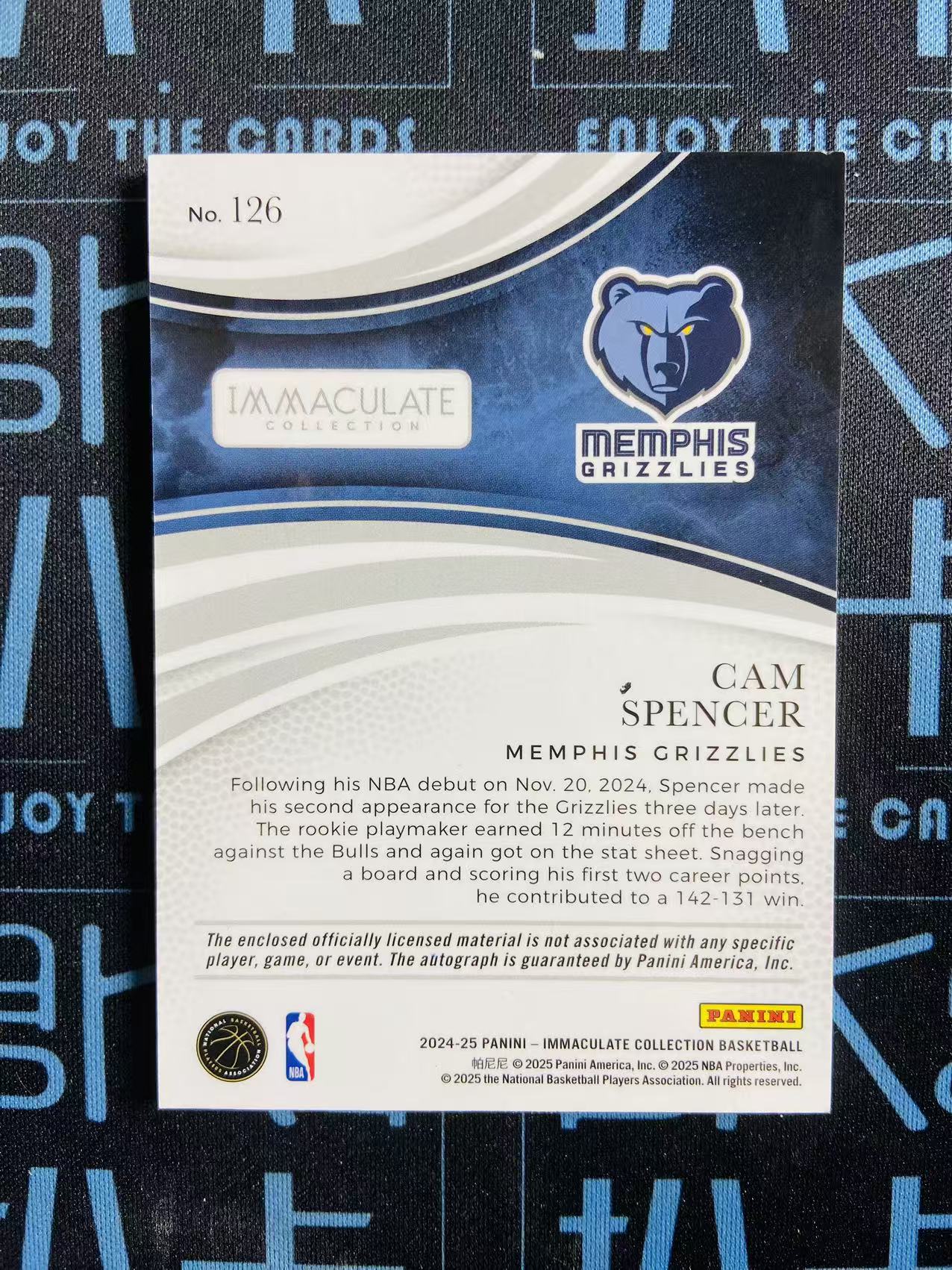 【要预付 找扒卡】2024-25 Panini Immaculate Cam Spencer imm 卡姆 斯潘瑟 灰熊 新秀RC 签字 卡签 3/3编 尾编 RTA RPA 球衣物料 tag 铂金闪版 瑕疵如图 美甲1026BK02