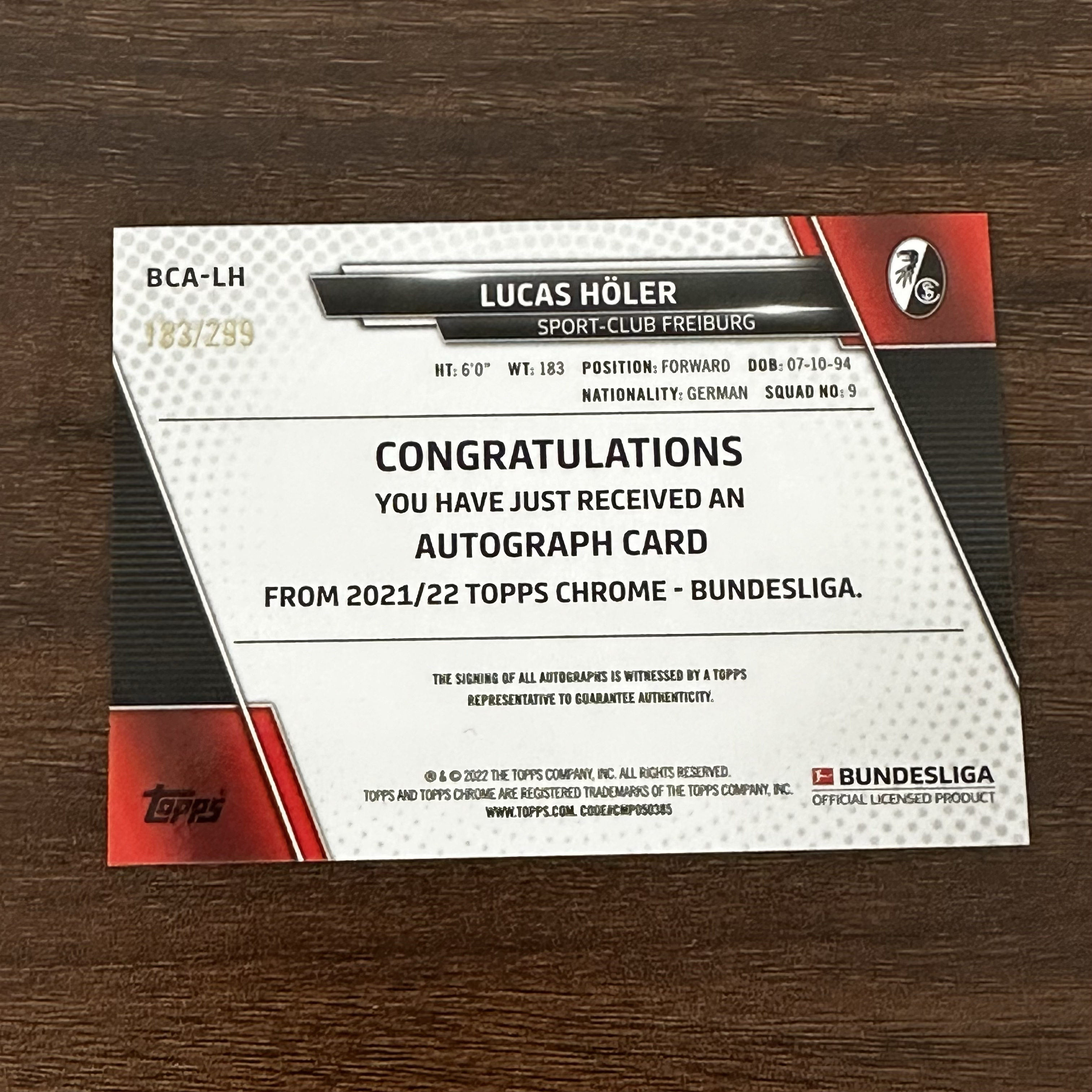 2022 Topps Chrome Lucas Höler 德甲TC 弗赖堡 卢卡斯 霍勒尔 蓝折 折射 签字 299编 卡品如图