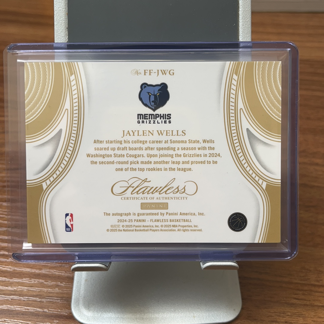 2024-25 Panini Flawless Jaylen Wells 手提 新秀RC 杰伦 威尔斯 签字 卡签 金平行 绝杀签 08/10编 限量 灰熊大热新星 专收必备