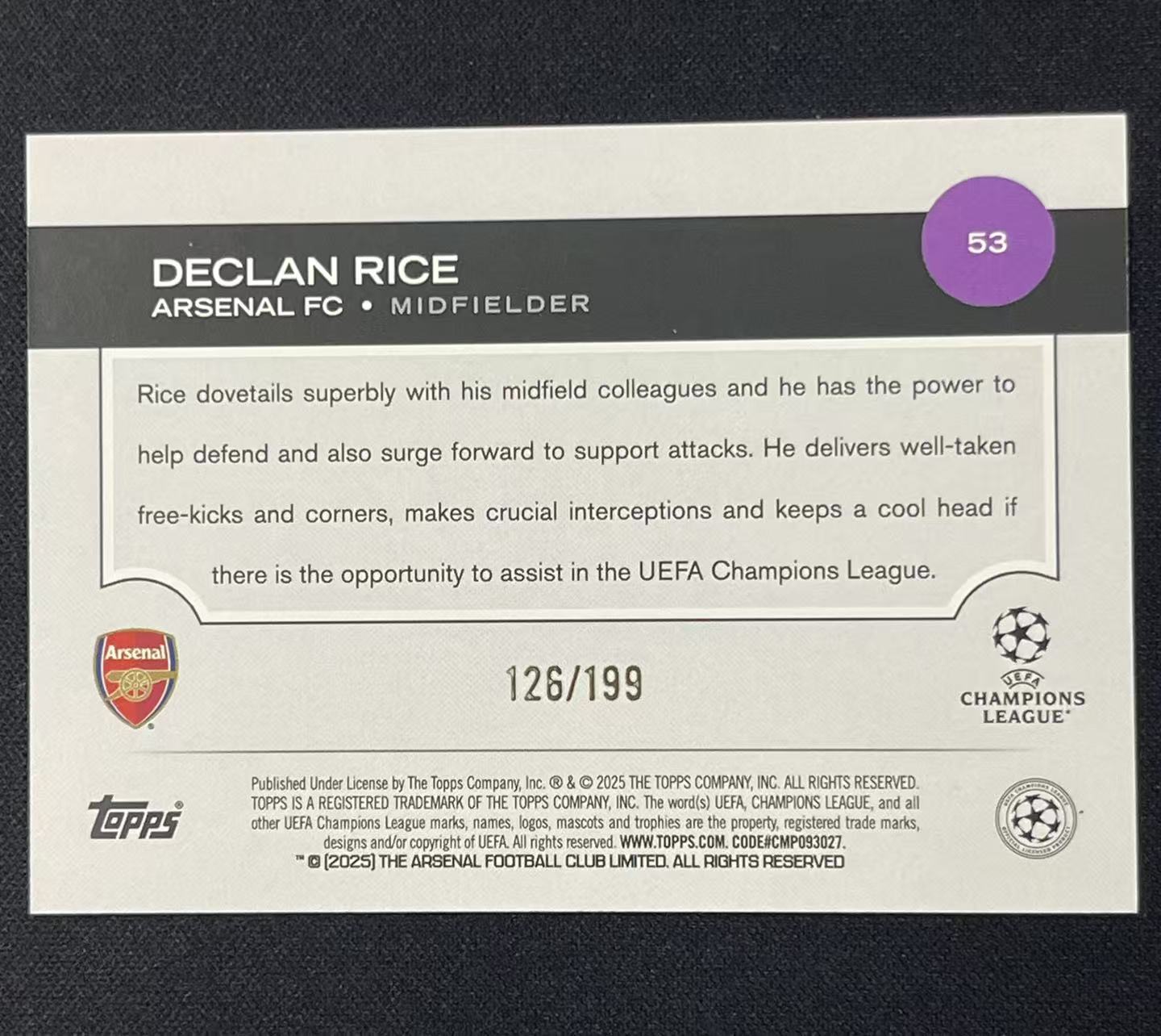 2025 Topps UCC Declan Rice #53 德克兰 赖斯 阿森纳 英格兰 绿折 126/199编  贝勒07