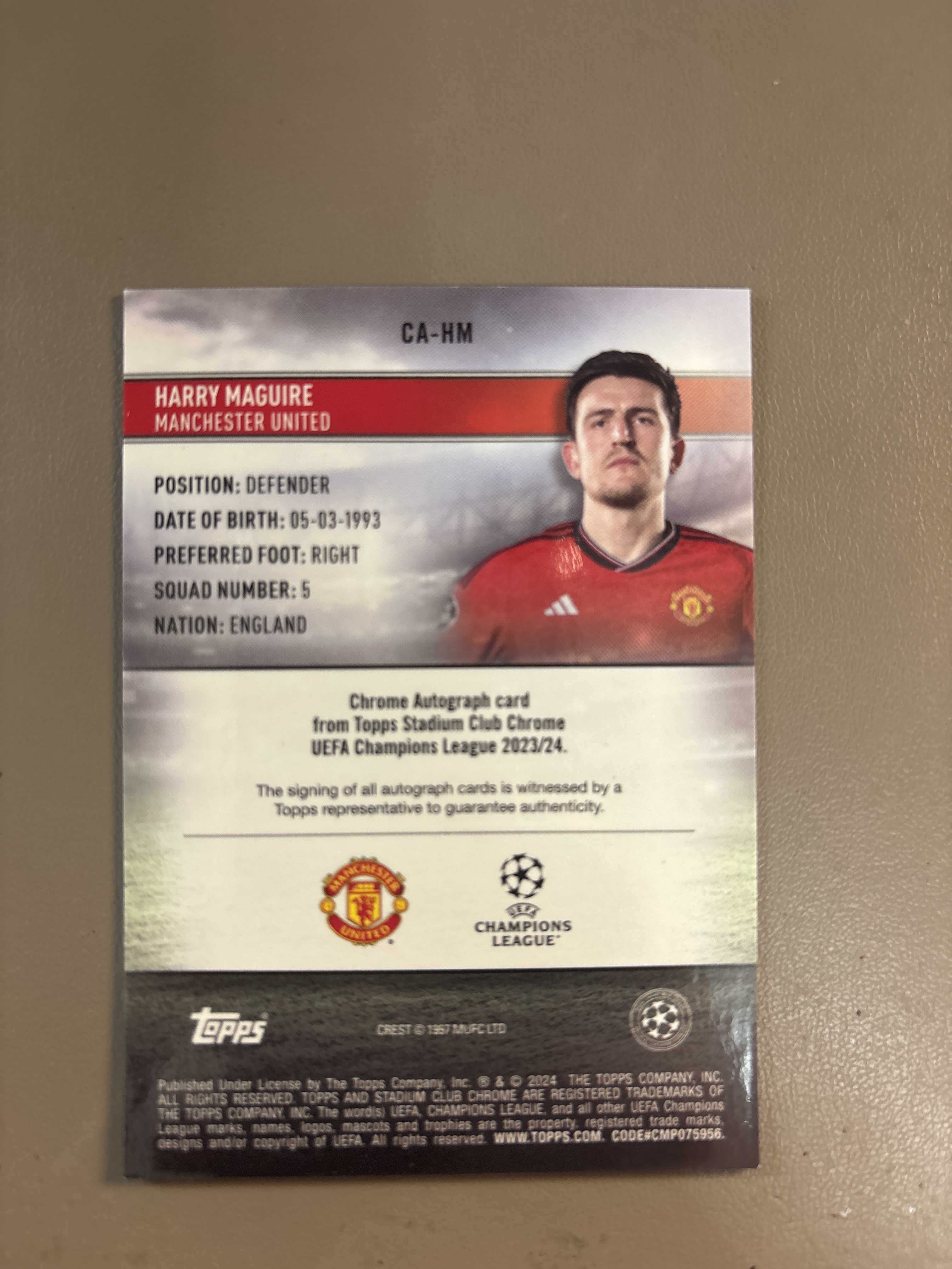 2023-24 Topps Stadium Club Harry Maguire 马奎尔 签字 签名 航母 欧冠 竞技场 银折 曼联 英格兰 折射 爆爆大宝1