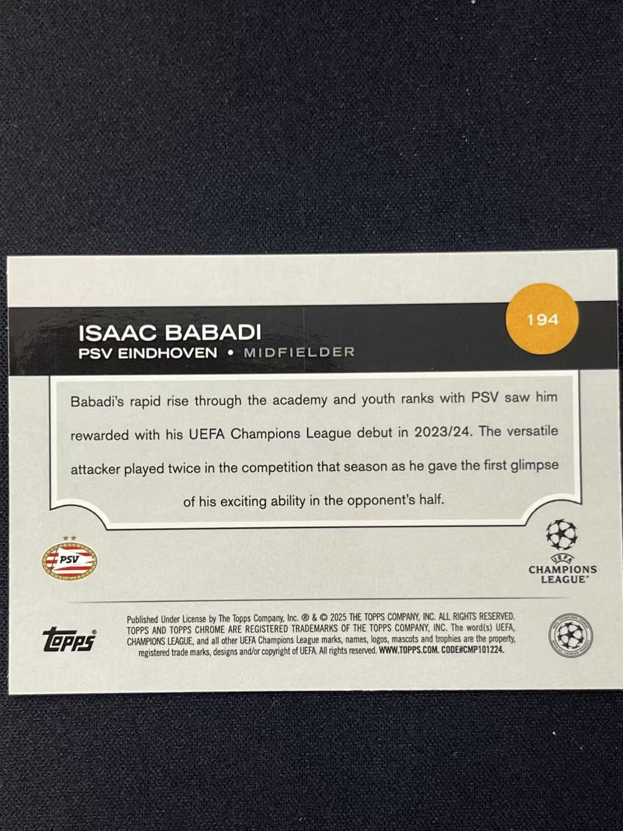 2025 Topps Chrome Isaac Babadi #194 巴巴迪 埃因霍温 荷兰 紫折 037/299编 贝勒06