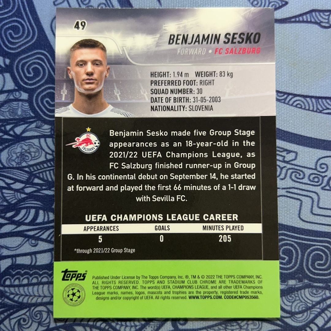2022 Topps Stadium Club Chrome Benjamin Sesko RC 欧冠 竞技场 莱比锡红牛 曼联 塞斯科 谢什科 新秀 蓝脉冲折 顶级射手 豪门猎物 专收必备!