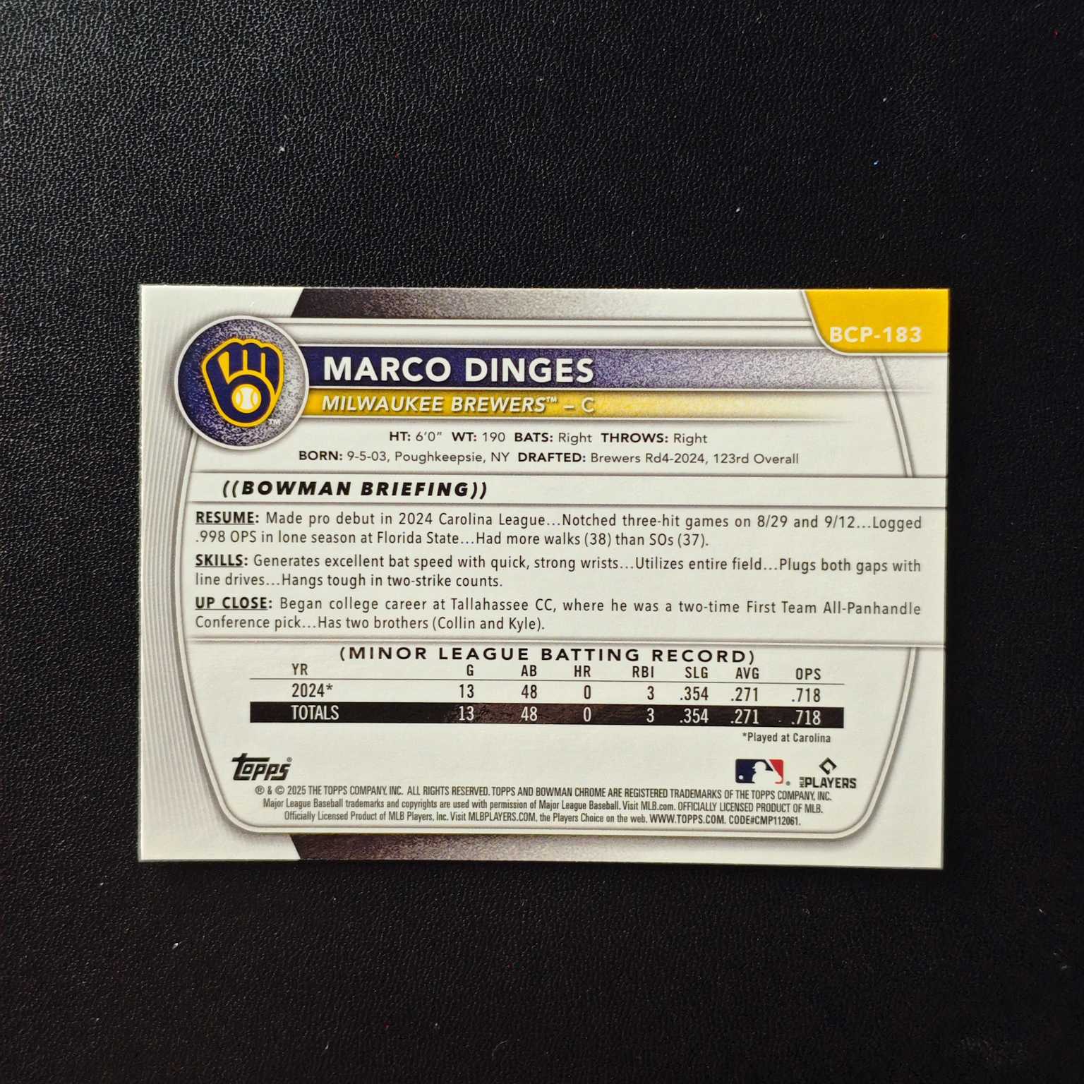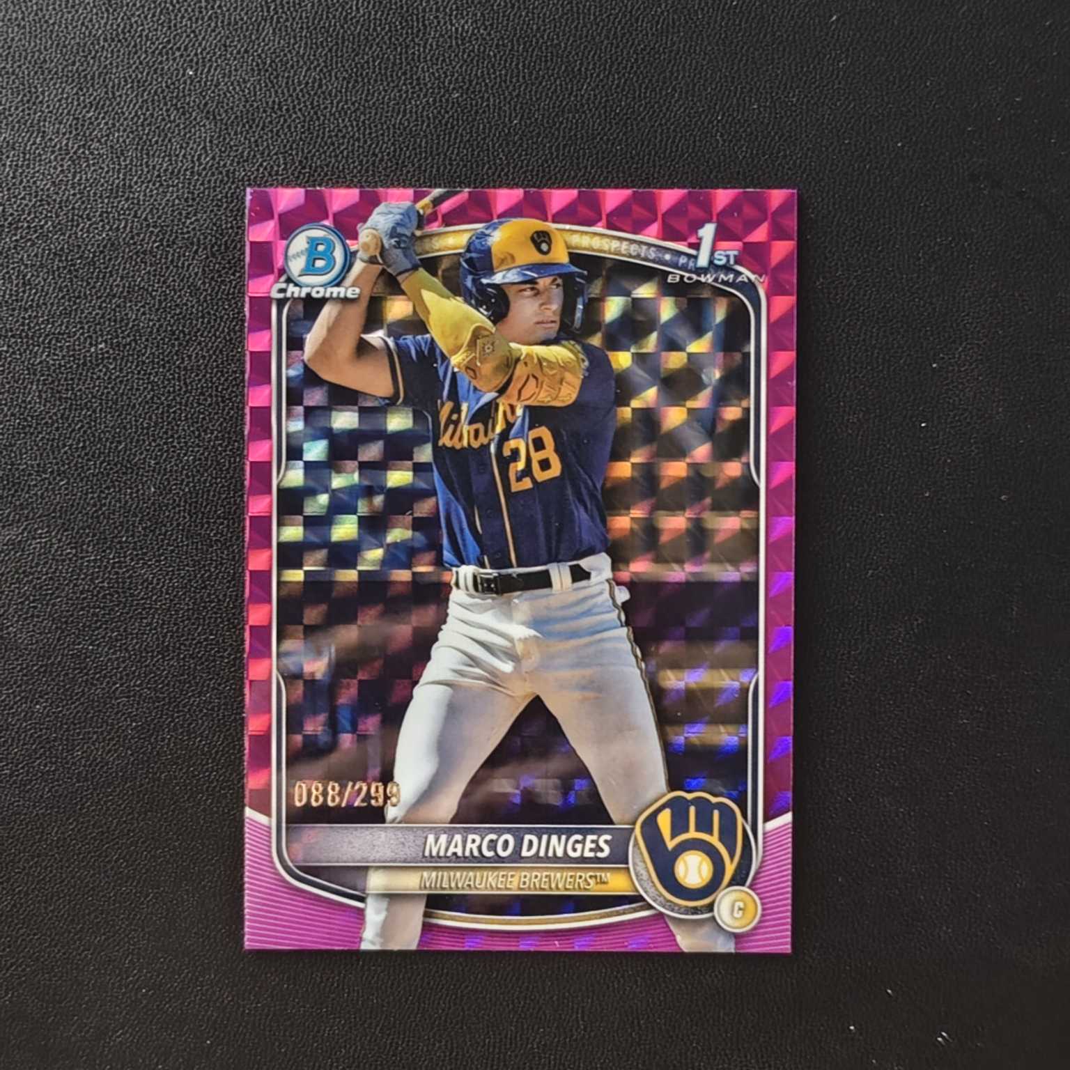 2025 Topps Bowman Chrome Marco Dinges RC 新秀 1st 299编 粉棱镜折 马尔科 丁格斯 密尔沃基酿酒人 (阿火)【JS卡牌潮玩】(卡品如图)