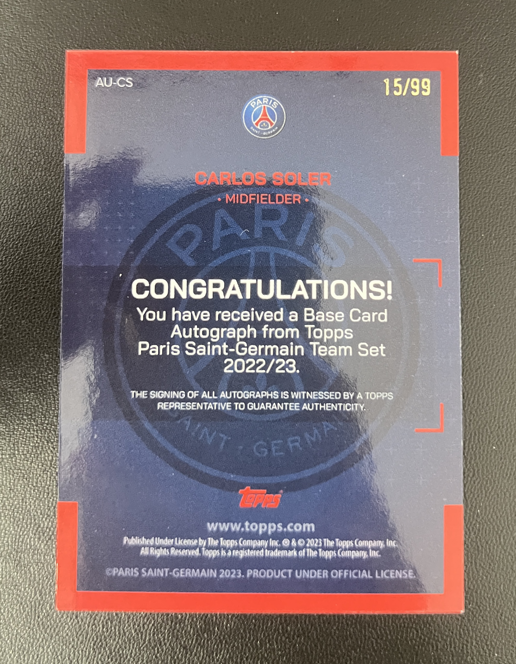 2023 Topps Topps Team Carlos Soler 卡洛斯 索勒 大巴黎 西班牙 巴黎圣日耳曼队盒 粉平行 99编 签字 签名