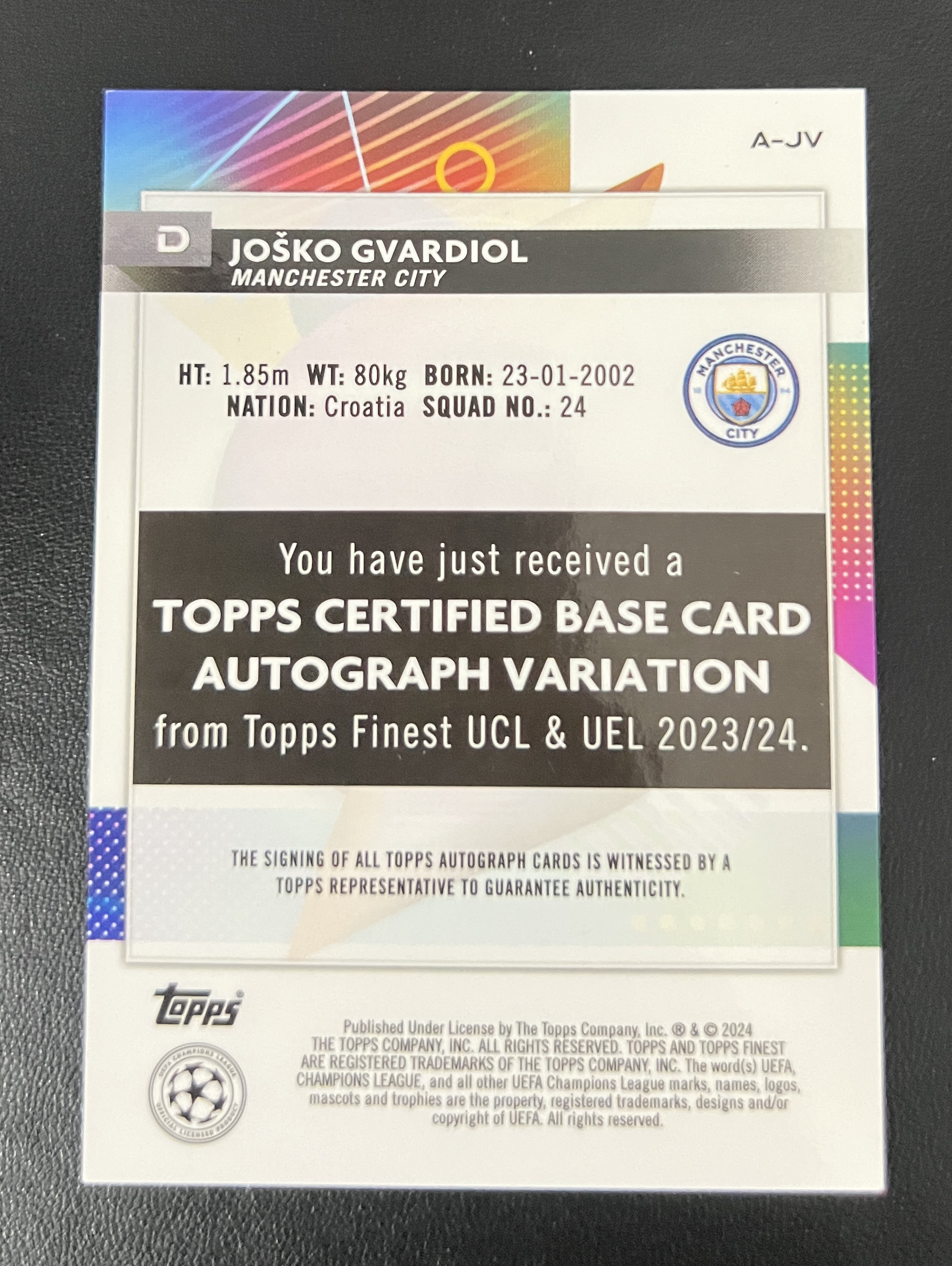 2024 Topps Finest 格瓦迪奥尔 2024 Topps Finest JOSKO GVARDIOL K 欧冠Finest 格瓦迪奥尔 曼城 莱比锡红牛 银折 折射 签字