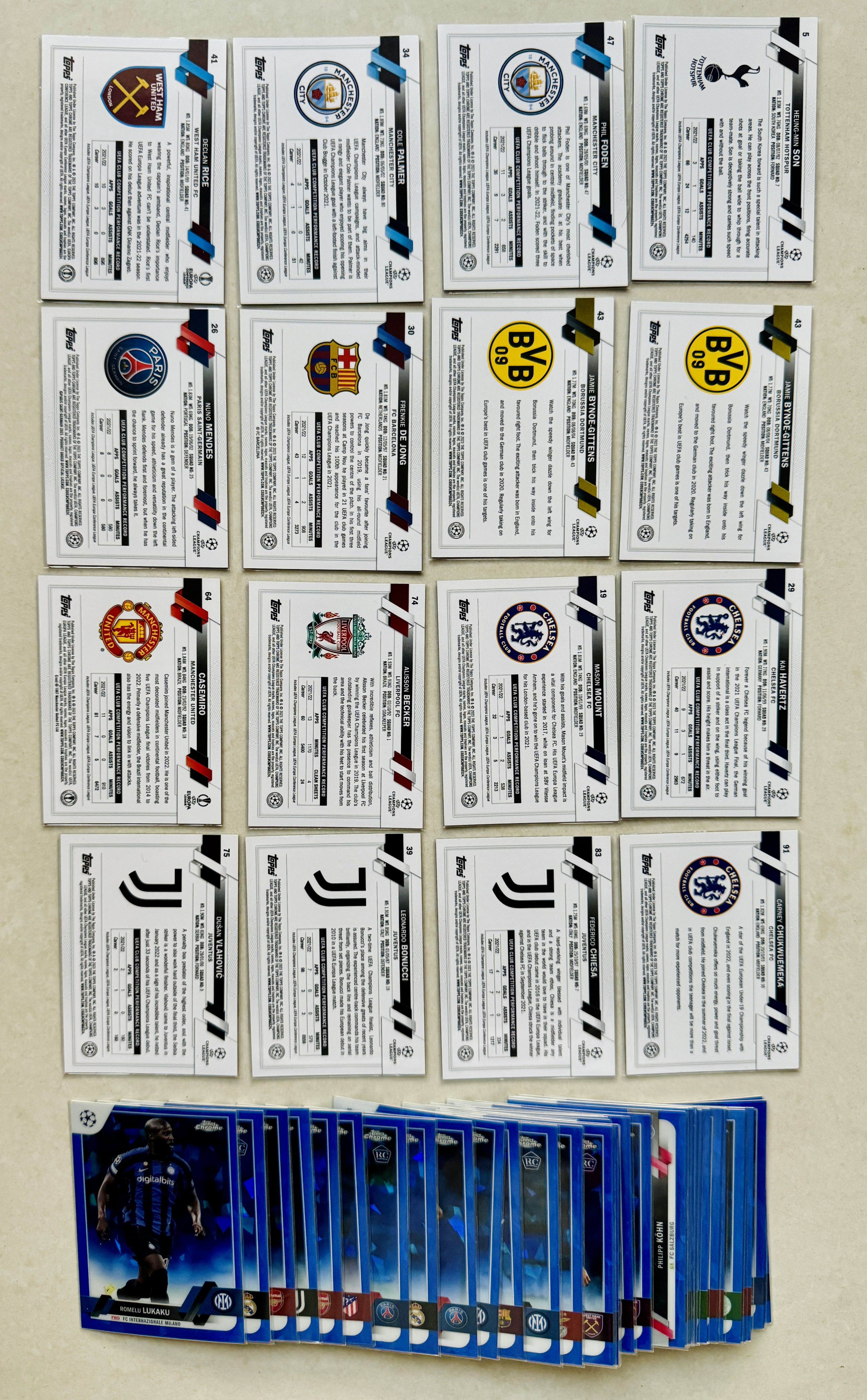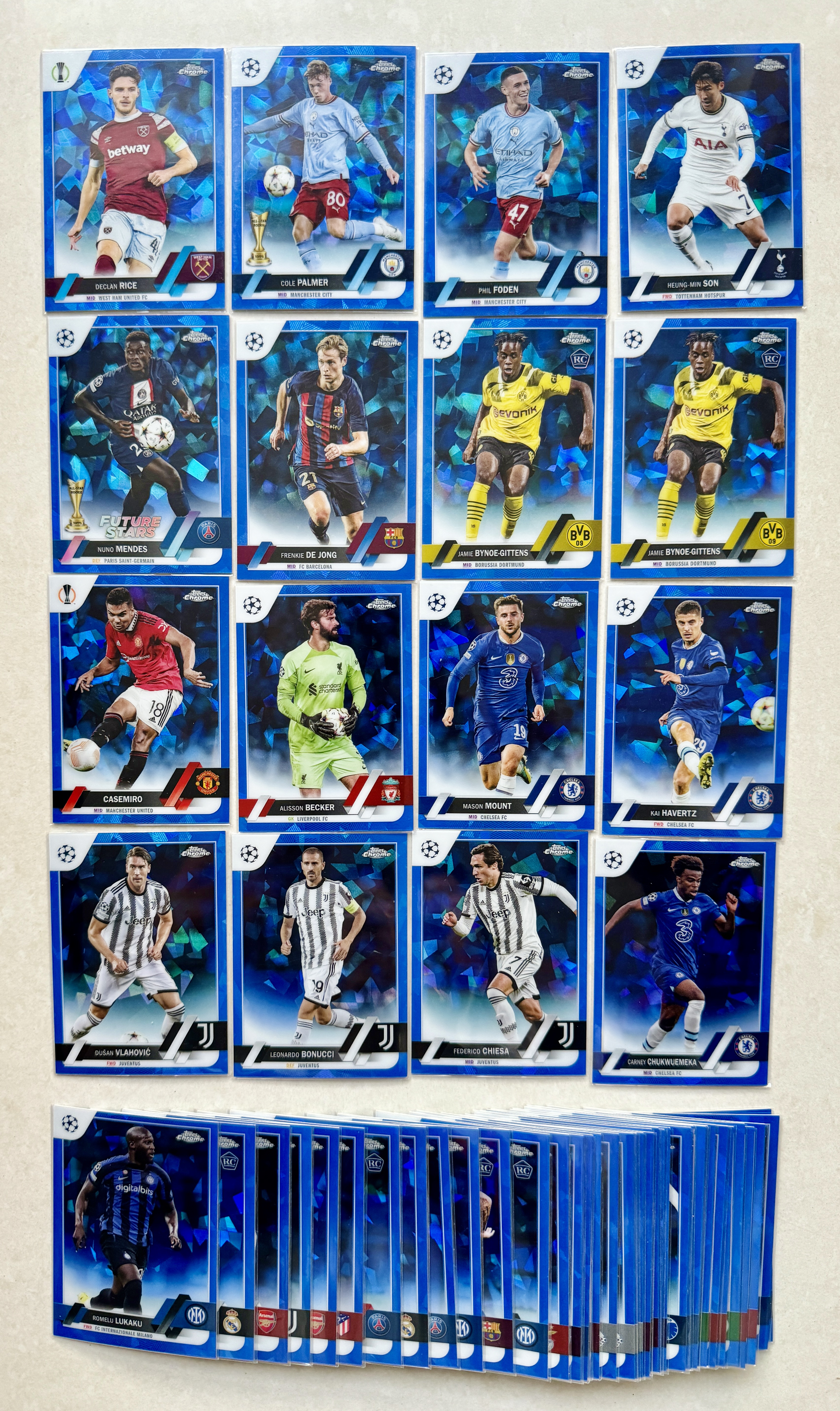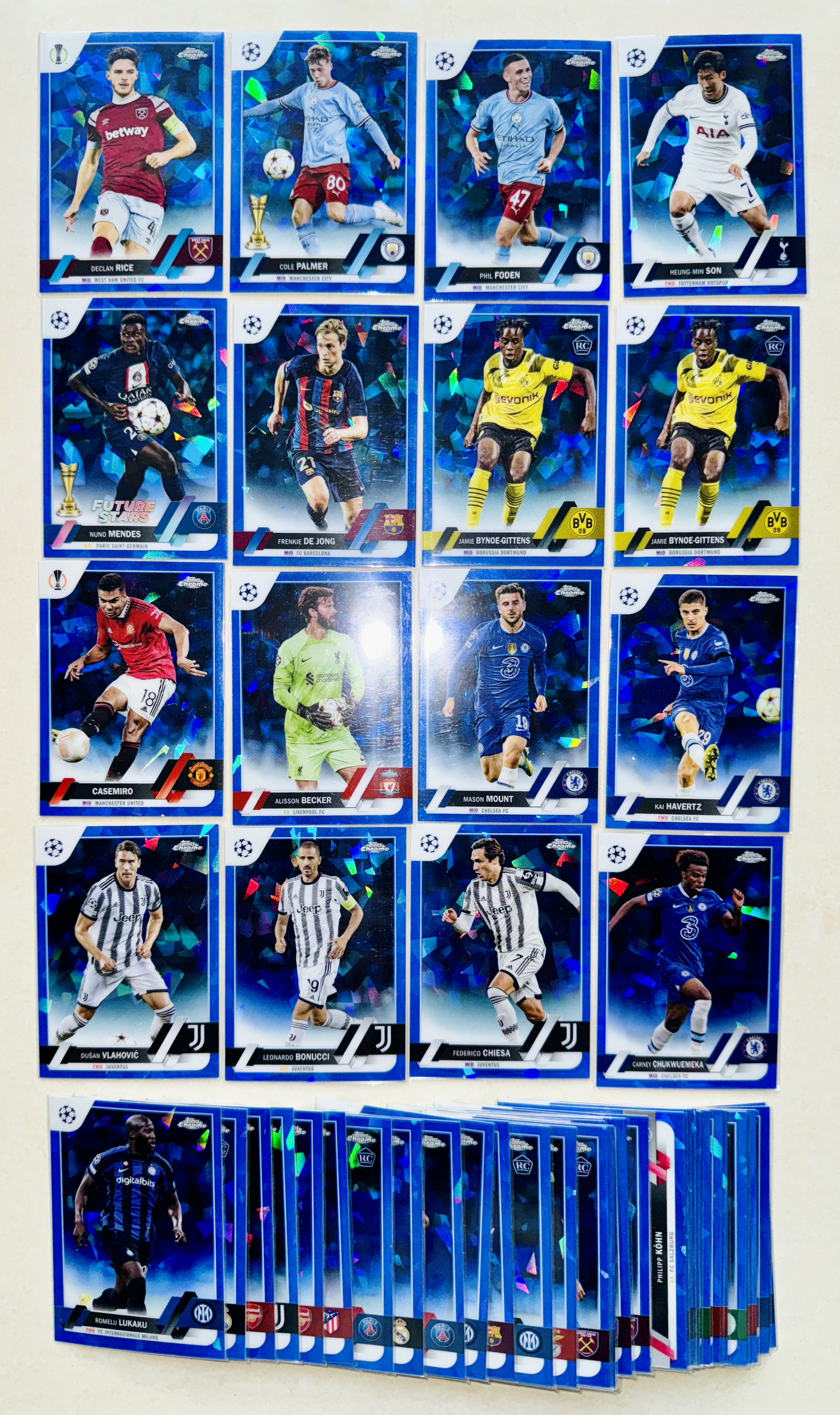 2023 Topps Chrome 蓝宝石盒 蓝碎冰 RC 巴萨大巴黎多特利物浦切尔西阿森纳曼城尤文 赖斯 帕尔默 福登 孙兴慜 门德斯 德容 吉滕斯 卡塞米罗 哈弗茨等52张保40个不同球员不保卡品