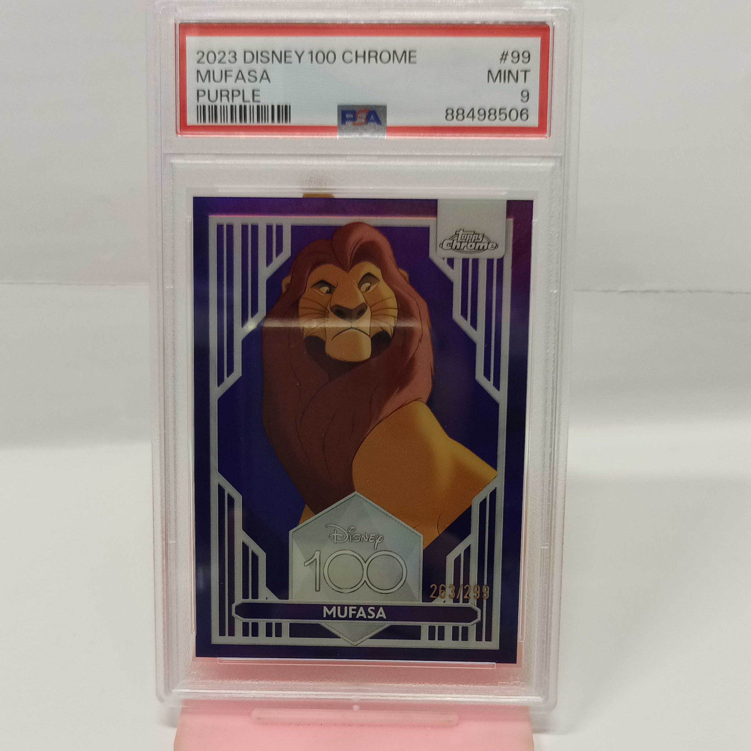2023 迪士尼100周年 Topps Chrome 系列纪念收藏卡 紫色版 蒂安娜公主 小鹿斑比 小熊维尼 屹耳 爱丽丝 乐佩 狮子王木法沙 编号99 PSA评分9分 收藏必备