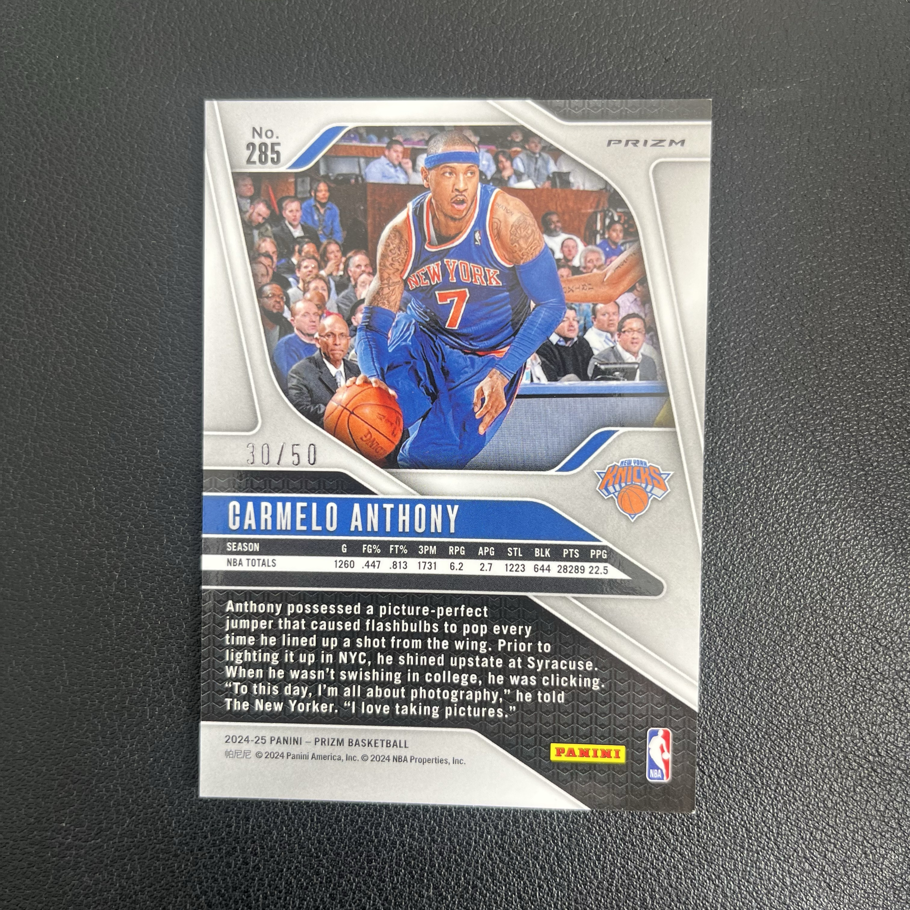 2024-25 Panini Prizm Carmelo Anthony 甜瓜 卡梅隆 安东尼 尼克斯 PZ系列 30/50编 低编 粉泡泡折 折射 实卡精美 收藏必备 卡品瑕疵如图(伟)