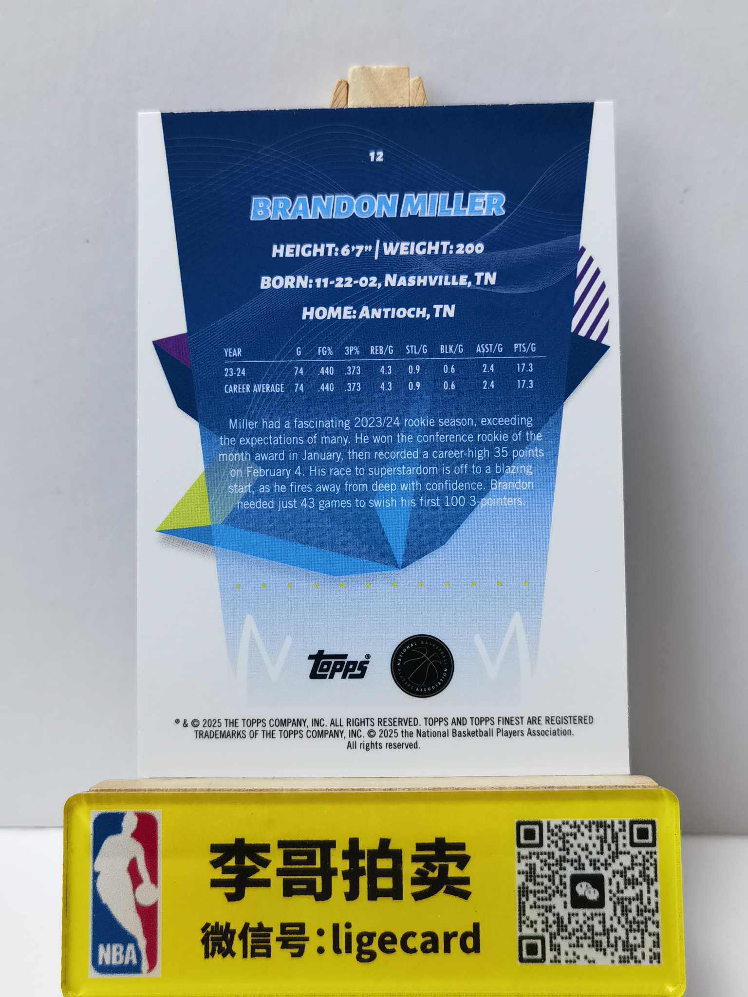 2024-25 Topps Finest Brandon Miller 【李哥代卖】布兰登米勒 175编 蓝折 CDZ117