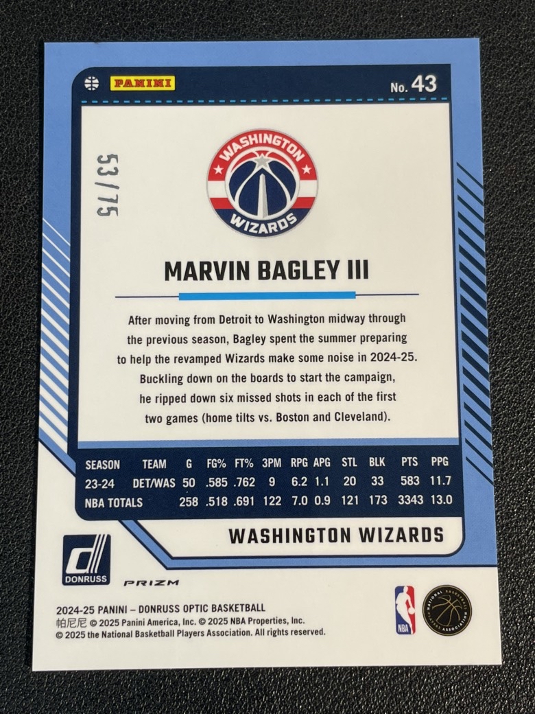2024-25 Panini Donruss Marvin Bagley III 13 马文 巴格利 奇才 杜蕾斯op 折射 黑金圈圈折 75编 微瑕如图 卡品如图 尖叫代拍 白白