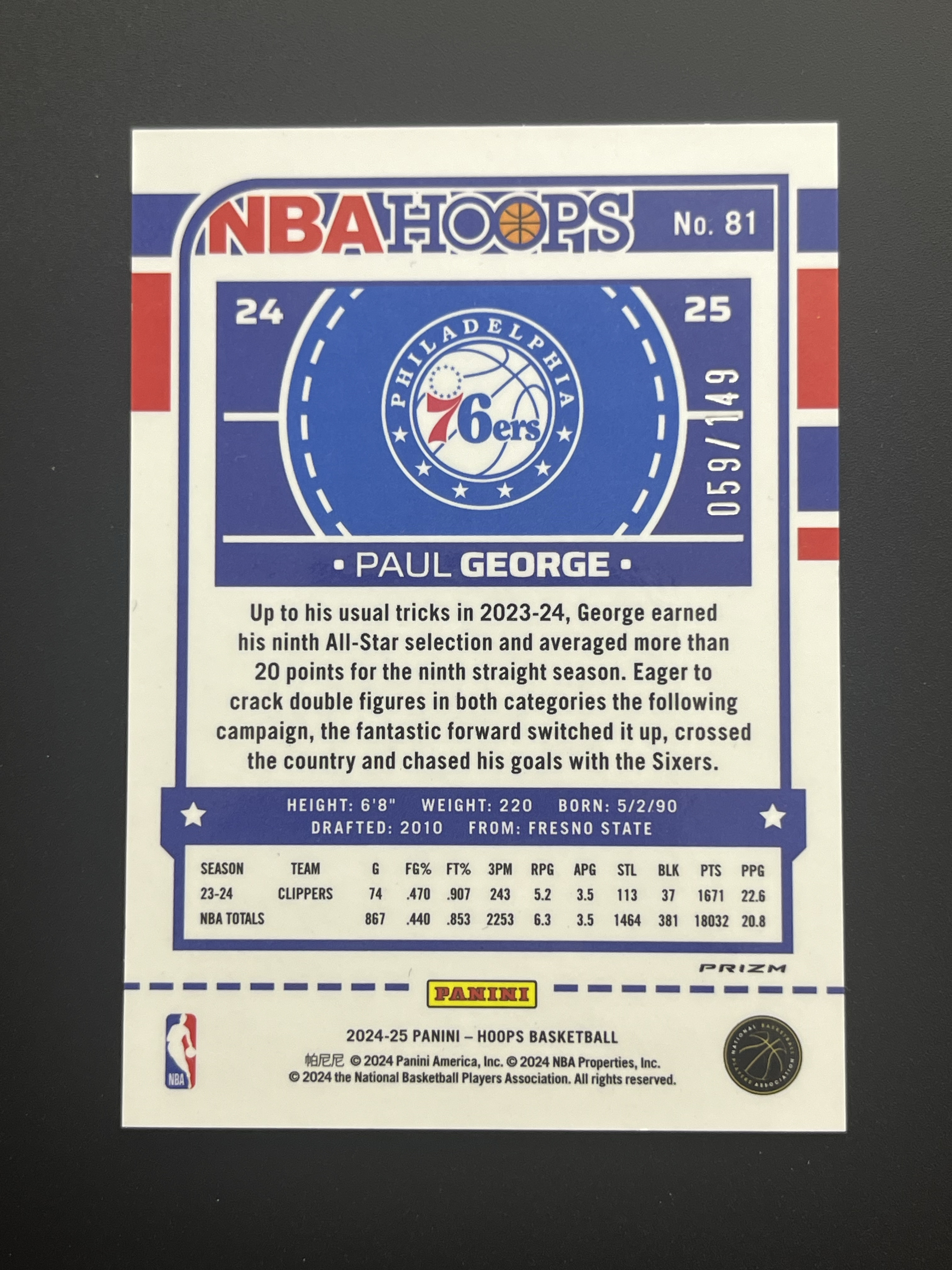 2024-25 Panini NBA Hoops Paul George 149编 折射 绿折 泡椒 保罗 乔治 76人时期 卡品如图