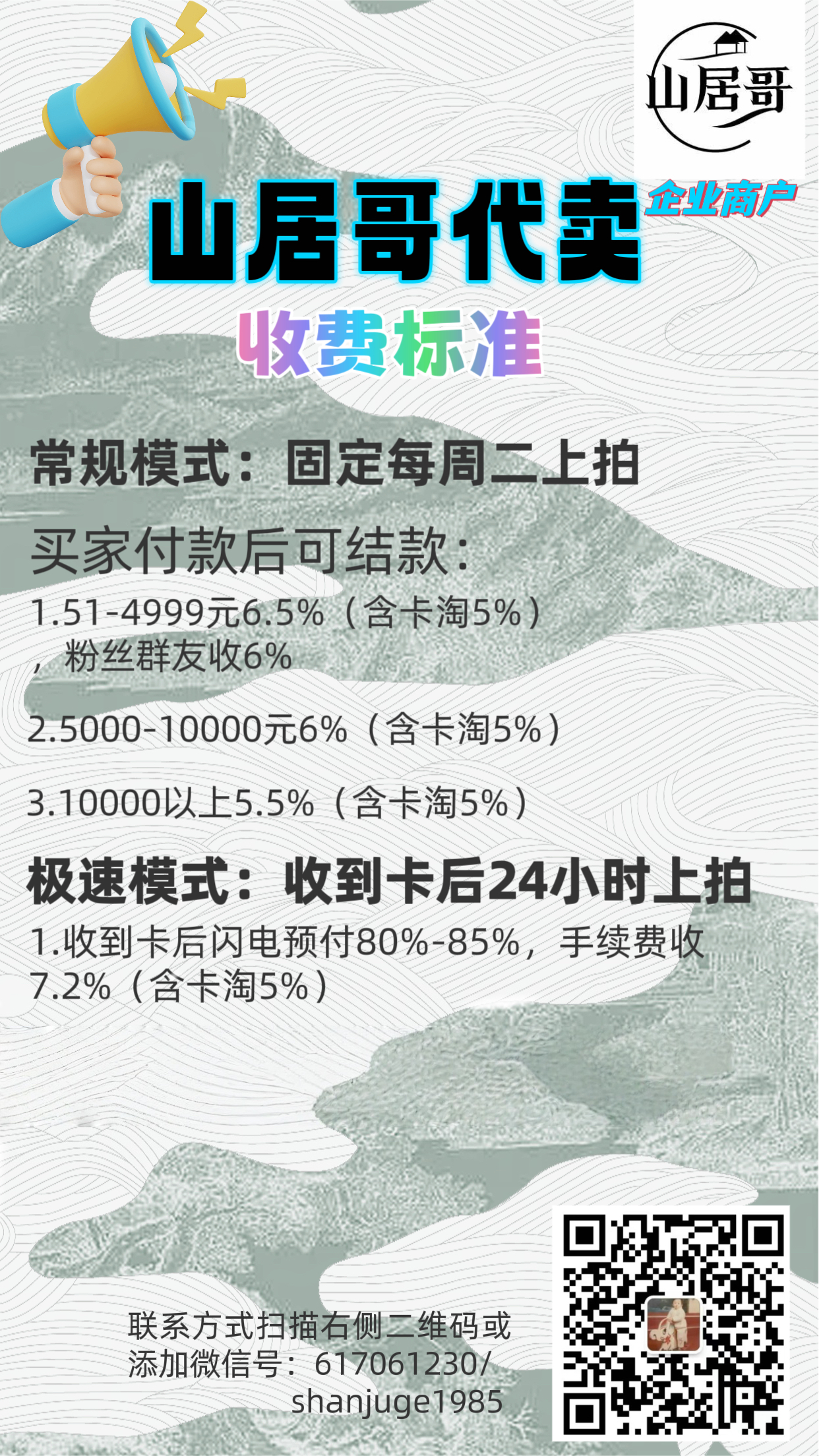 本卡片为个人寄售商品!!!【山居哥代卖】承接代卖 请阅读后竞价 大额预付85%-90%!卡到预付!截标预付!闪电回款! 微信:617061230 1.本店企业商户,线上支付,直接付款给平台!付款后一定站内信留言!   2.为了卡片安全,只发顺丰陆运,超过1000元建议顺丰到付实价保价,如因未保价快递中有任何问题导致卡品受损遗失等买家联系快递处理赔付,本店也会协助您处理相关问题,一律发陆运,如需发空运站内信留言即可。一般一周发两次货,会根据付款顺序3日内发出。   3.卡品如图,一般通行品以上,如无说明则为通行品,如有瑕疵会提供文字说明。国宝imm等系列厚卡,老卡有白边白角属于正常卡品,镜面卡签有小划痕属于正常通行品相,评级卡砖上的划痕破损不属于品相问题,一定把拍卖图片看清,折射系列不保证金标,要评级追求金标者请直接购买金标。拍后请于3日内付款,5日内不付款将直接申请投诉封号.   4.需要改地址的请付款前在订单里改好,只发默认地址。   5.重要的事情说三遍:本店不支持累计,本店不支持累计,本店不支持累计,不接受任何转让转拍合并发货的卡,买家若转让可将卡发回后自行处理。卡淘留言看到后会第一时间给您回复。联系方式:wx617061230