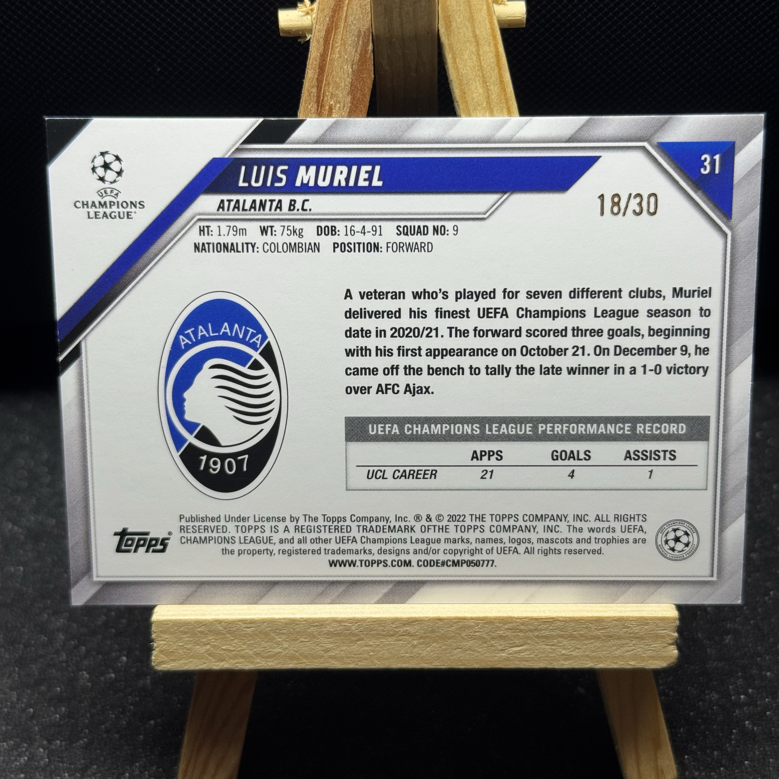 2022 Topps UCC Luis Muriel RC 欧战 欧冠 意甲 亚特兰大 18/30编 穆里尔 1st 横版Base 收藏必备