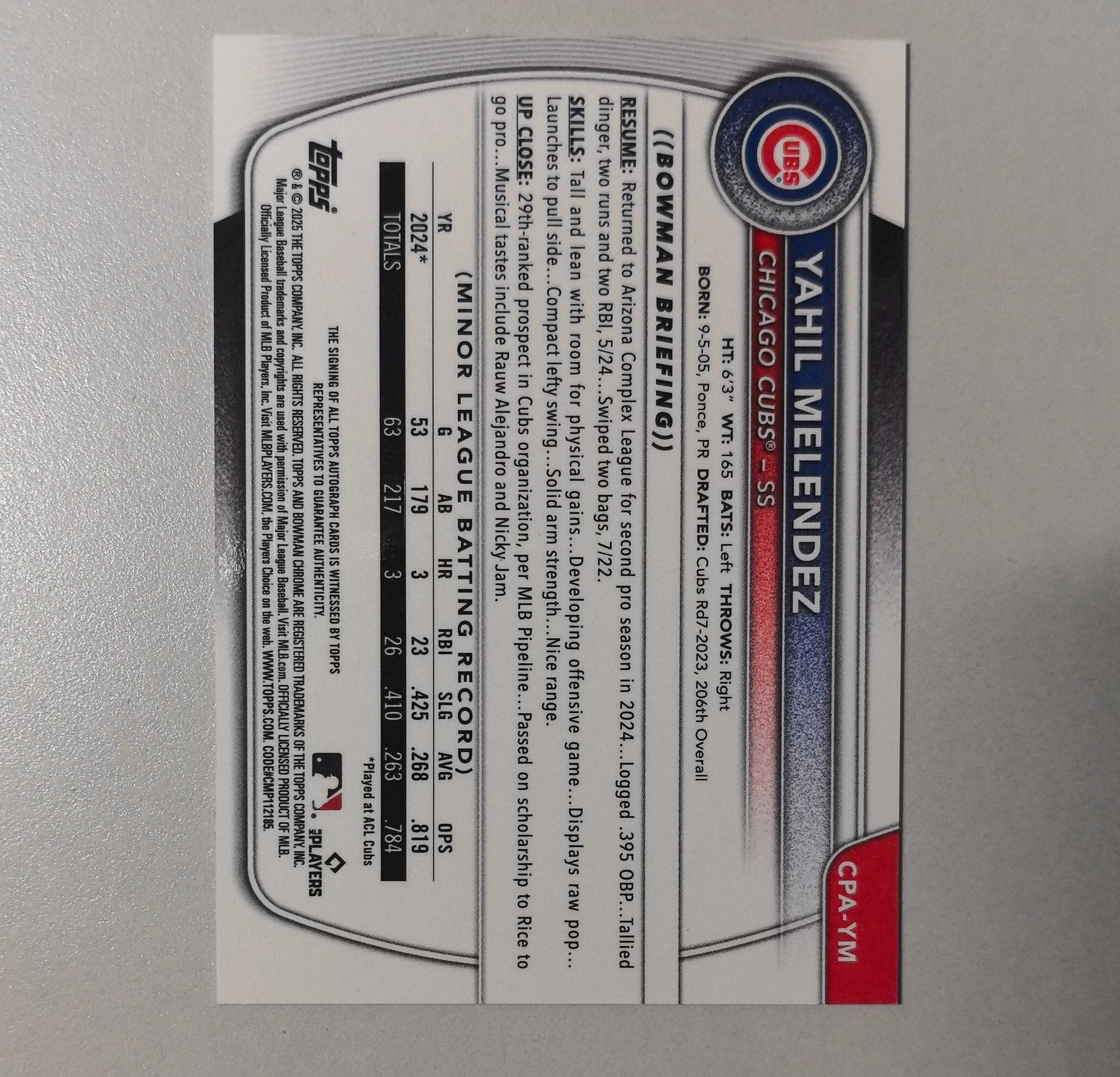 2025 Topps 【锡安代卖】 累计照常 棒球mlb bowman 1st新秀签字卡签 蓝龙鳞折150编 芝加哥小熊热门海外大物 Yahil Melendez 卡品如图 卖卡锡