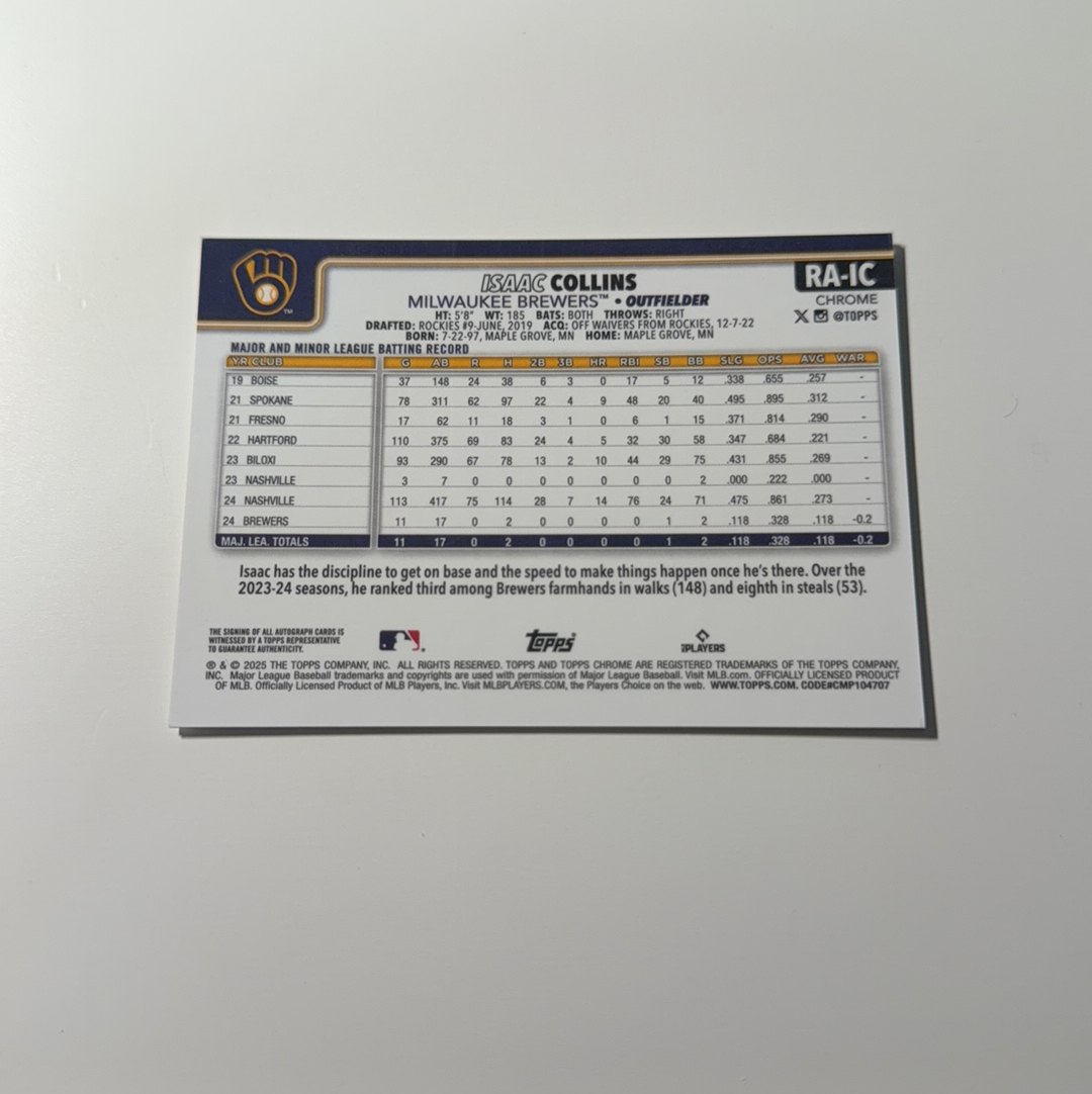 2025 Topps 【锡安代卖】 累计照常 棒球mlb Chrome Isaac Collins RC MBL 艾萨克 柯林斯 新秀 RC 签字 卡签 密尔沃基酿酒人 卡品如图 烧麦