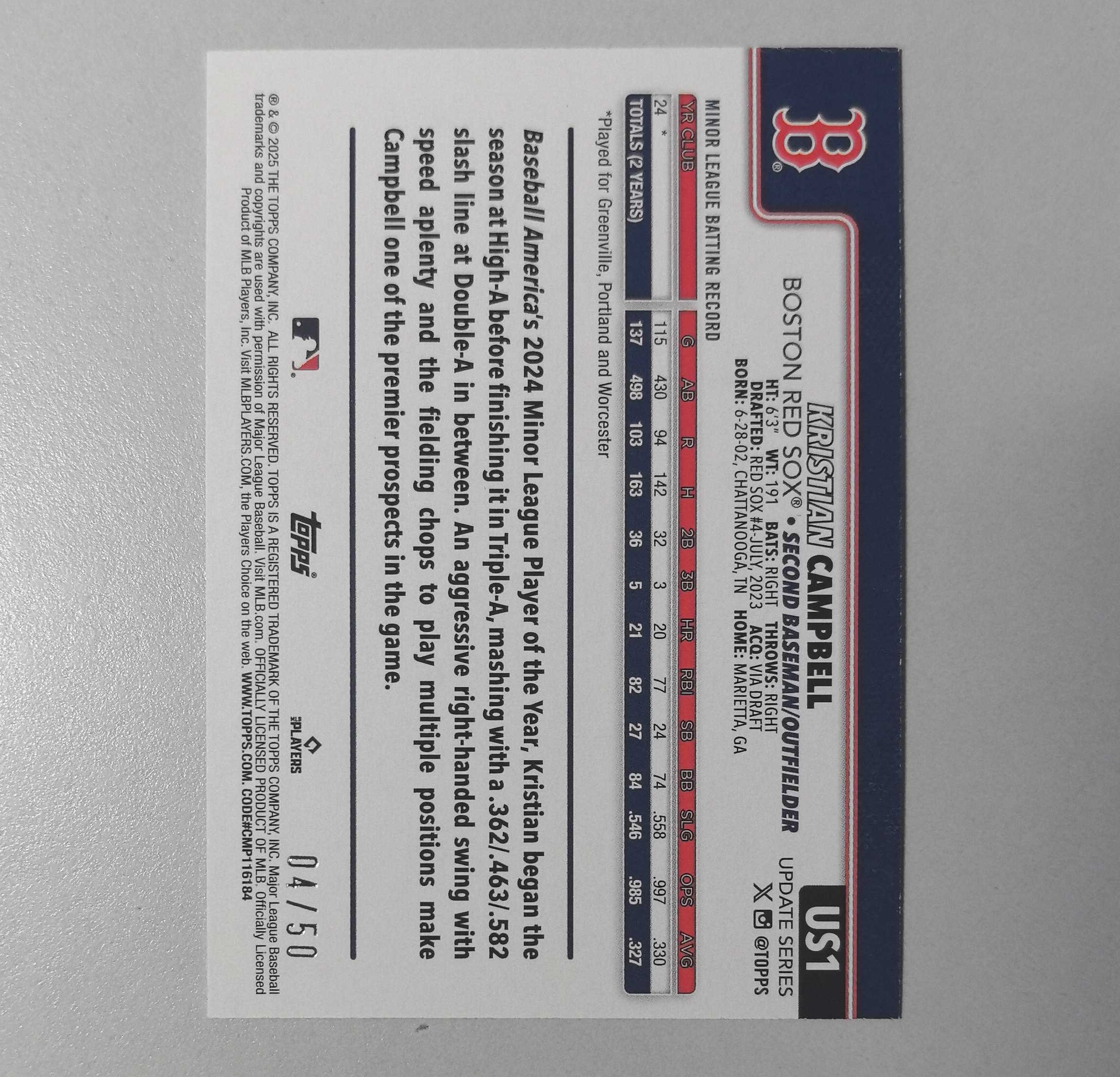 2025 Topps 【锡安代卖】 累计照常 棒球mlb series update 金平行50编 波士顿红袜热门新秀 kristian Campbell 坎贝尔 卡品如图 沪瘪陆