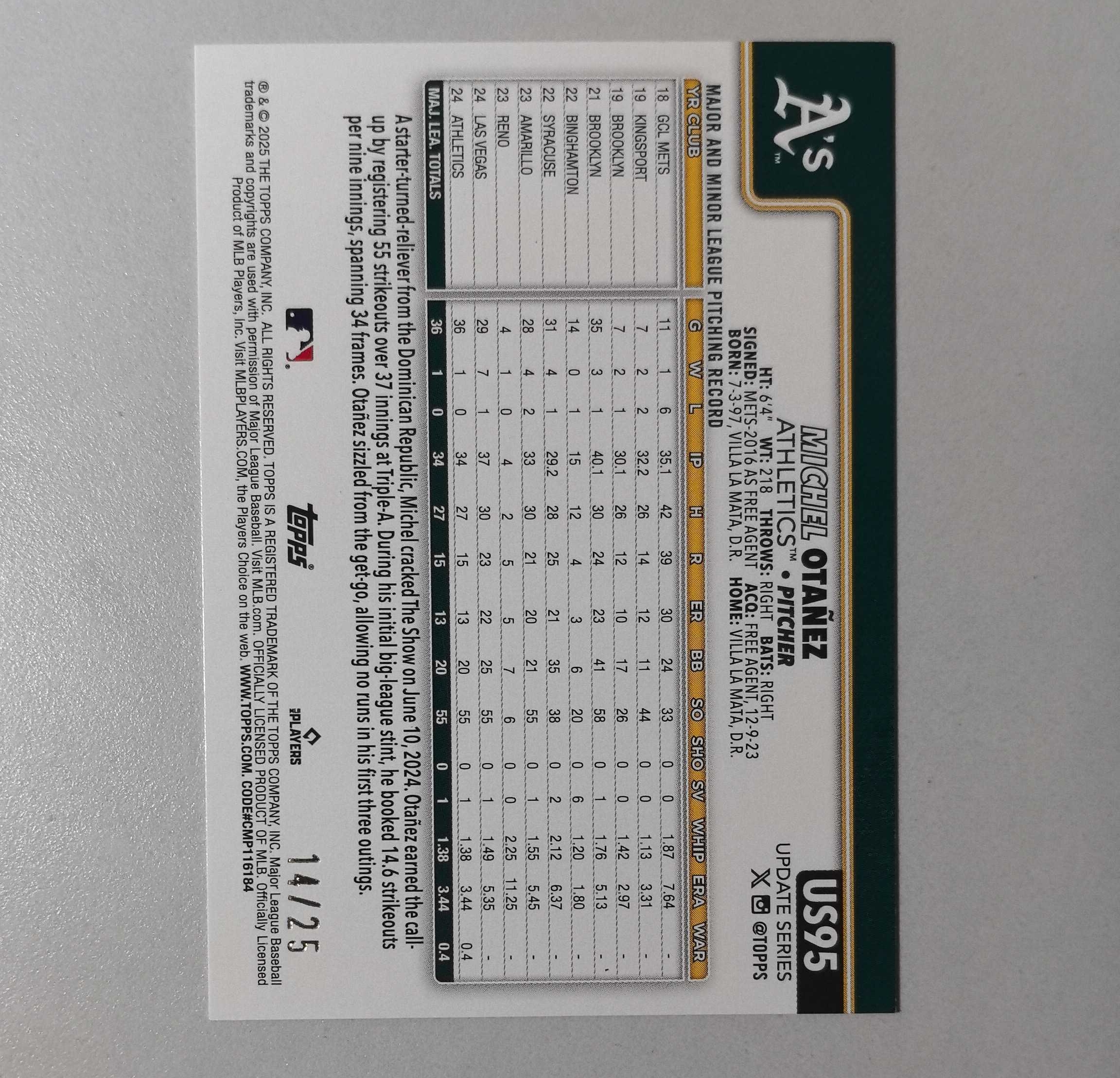 2025 Topps 【锡安代卖】 累计照常 棒球mlb series update 橙平行25编 奥克兰运动家热门新秀 Mitch Otanez 卡品如图 飞机盒